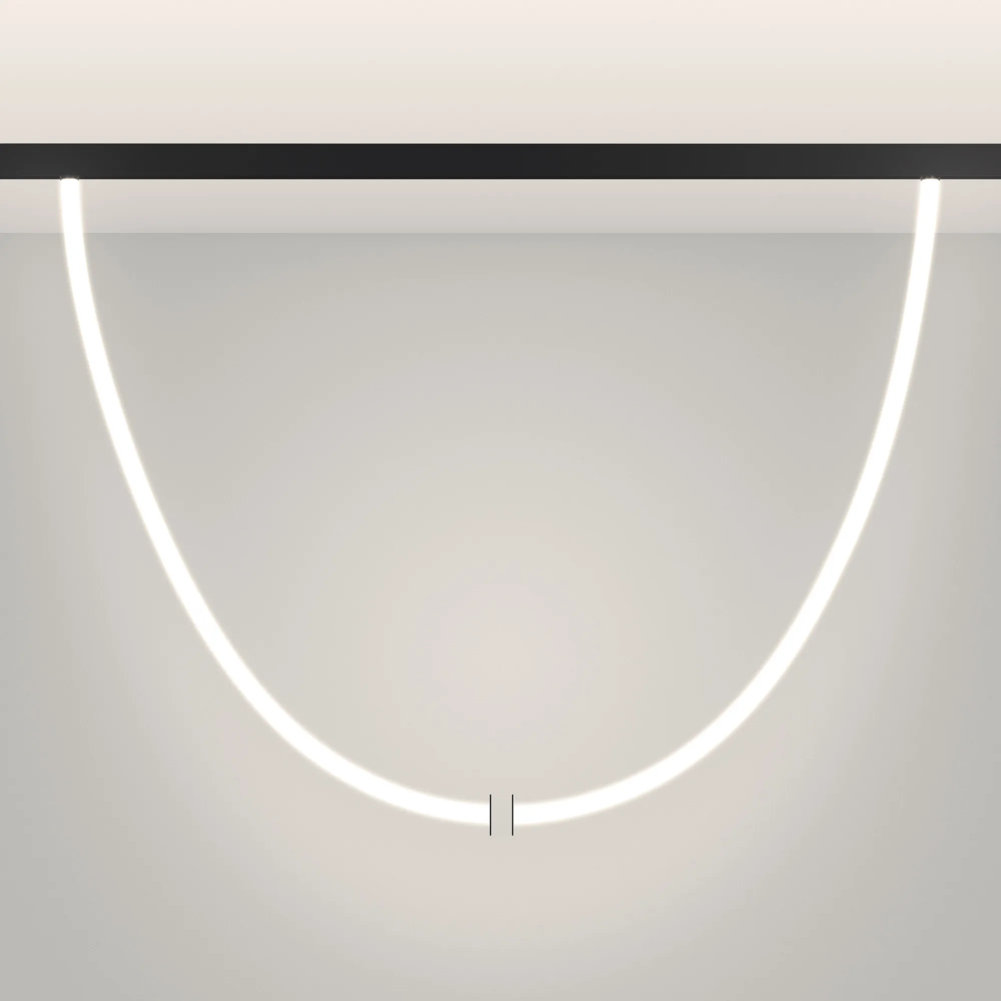 Светильник гибкий для магнитных треков серии ORIENT. Мощность 70 Вт, св. поток 4550 лм, 65 лм/Вт, дневной 4000 K, CRI>90, угол 360°, напряжение питания 48 В. Матовый белый фигурный корпус из силикона с черными креплениями. Размер: диаметр 25 мм, длина 5000 мм. Монтаж на магнитный трек ORIENT. Адаптеры входят в комплект.