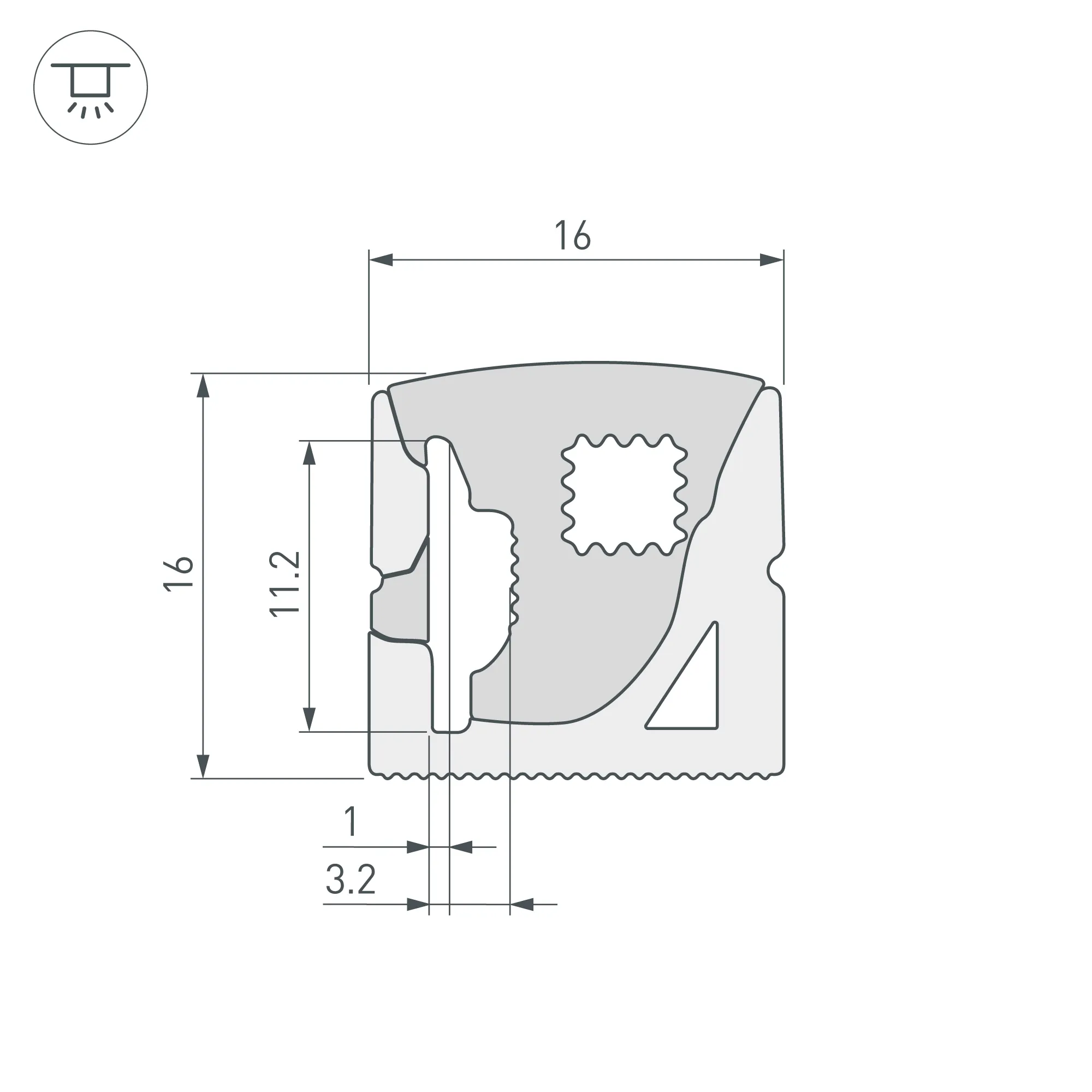 Цельнолитой силиконовый гибкий профиль, белый матовый. Габаритные размеры 50000×16×16 мм. Горизонтальный изгиб SIDE, минимальный радиус изгиба 30 мм. Для установки во влажных помещениях необходима герметизация при помощи двухкомпонентного эпоксидного герметика. Класс пылевлагозащиты – IP65 (при соблюдении технологии герметизации). Для лент шириной от 8 до11 мм, высотой до 3,3 мм и мощностью до 10 Вт/м. При подборе ленты необходимо учитывать, что втяжка лент COB, герметичных лент и лент с наличием силиконового слоя может быть затруднена. Угол излучения 110°. Поставляется в катушках по 50 м. Цена за 1 м.