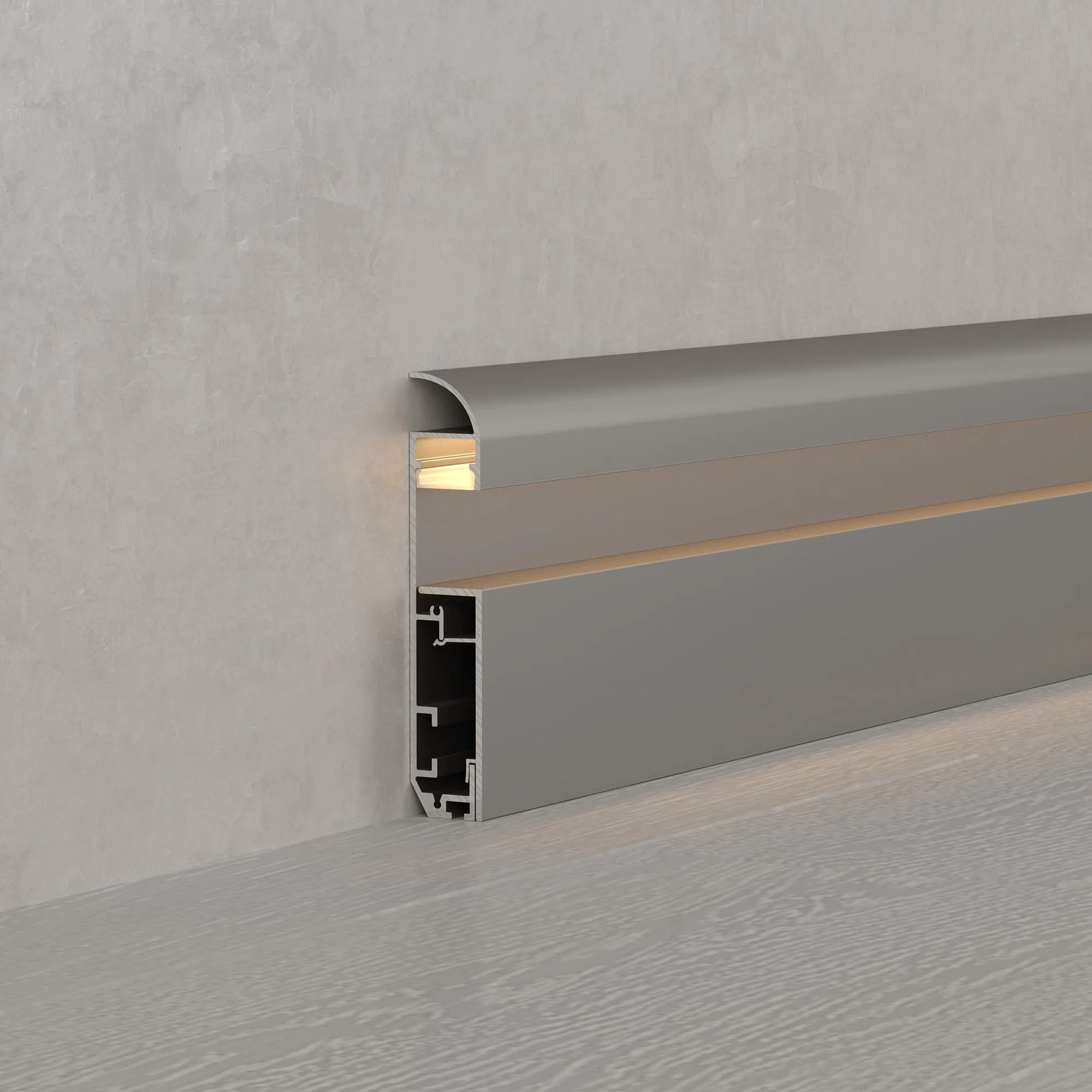 Алюминиевый анодированный накладной двухкомпонентный профиль-плинтус для светодиодных лент и линеек. Габаритные размеры (L×W×H): 2000x14,8x79,7 мм. Ширина площадки для ленты 12,2 мм. Аксессуары приобретаются отдельно. Цена за метр.