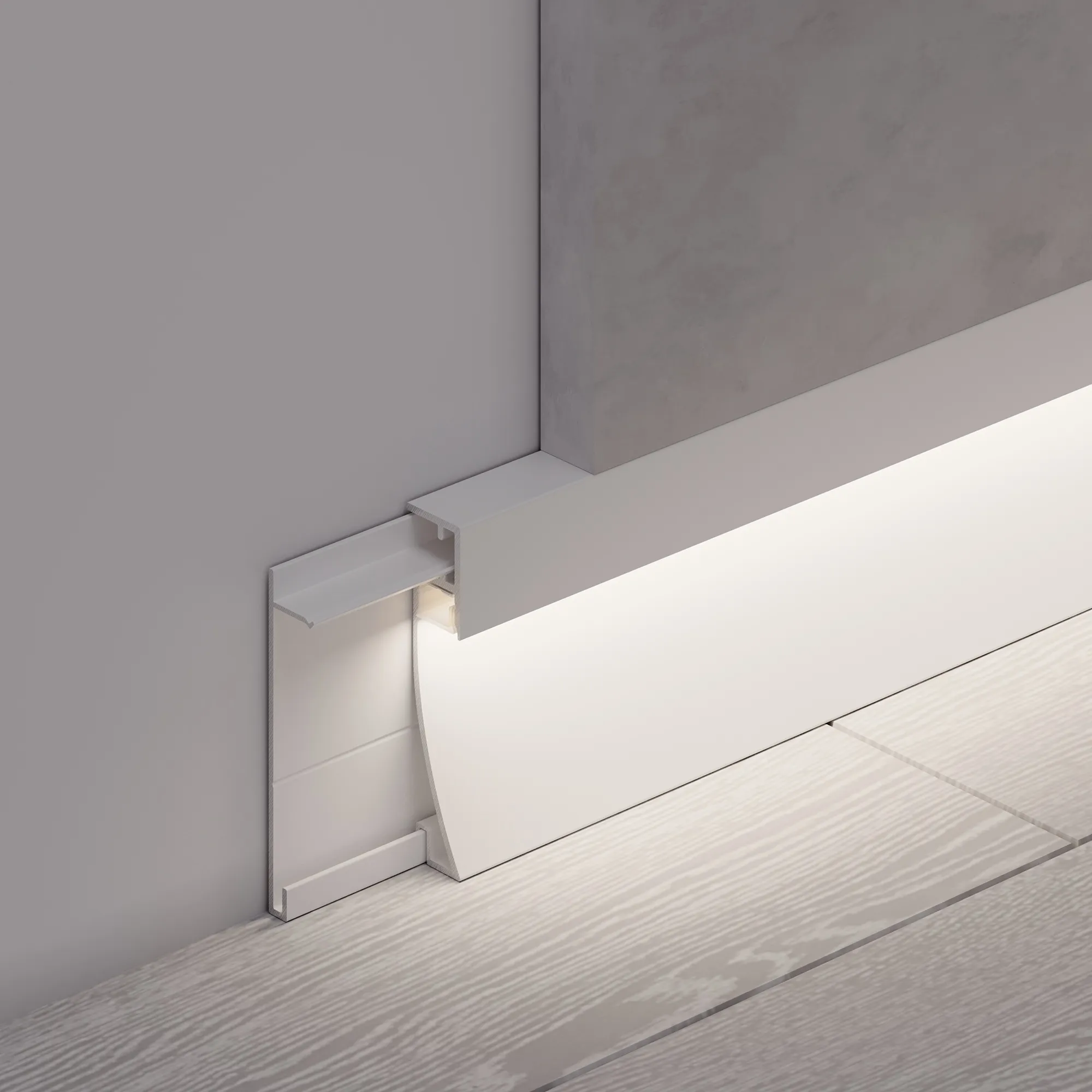 Алюминиевый накладной двухкомпонентный профиль-плинтус для светодиодных лент и линеек. Цвет - белый RAL9003 (порошковая окраска). Габаритные размеры (L×W×H): 2000x12,2x53,3 мм. Ширина площадки для ленты 8 мм. Аксессуары приобретаются отдельно. Цена за метр.