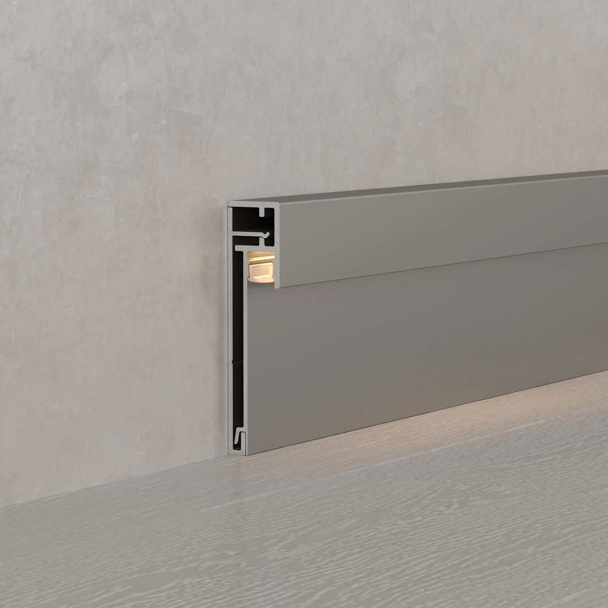 Алюминиевый анодированный накладной двухкомпонентный профиль-плинтус для светодиодных лент и линеек. Габаритные размеры (L×W×H): 2000x12,3x52,6мм. Ширина площадки для ленты 5 мм. Аксессуары приобретаются отдельно. Цена за метр.