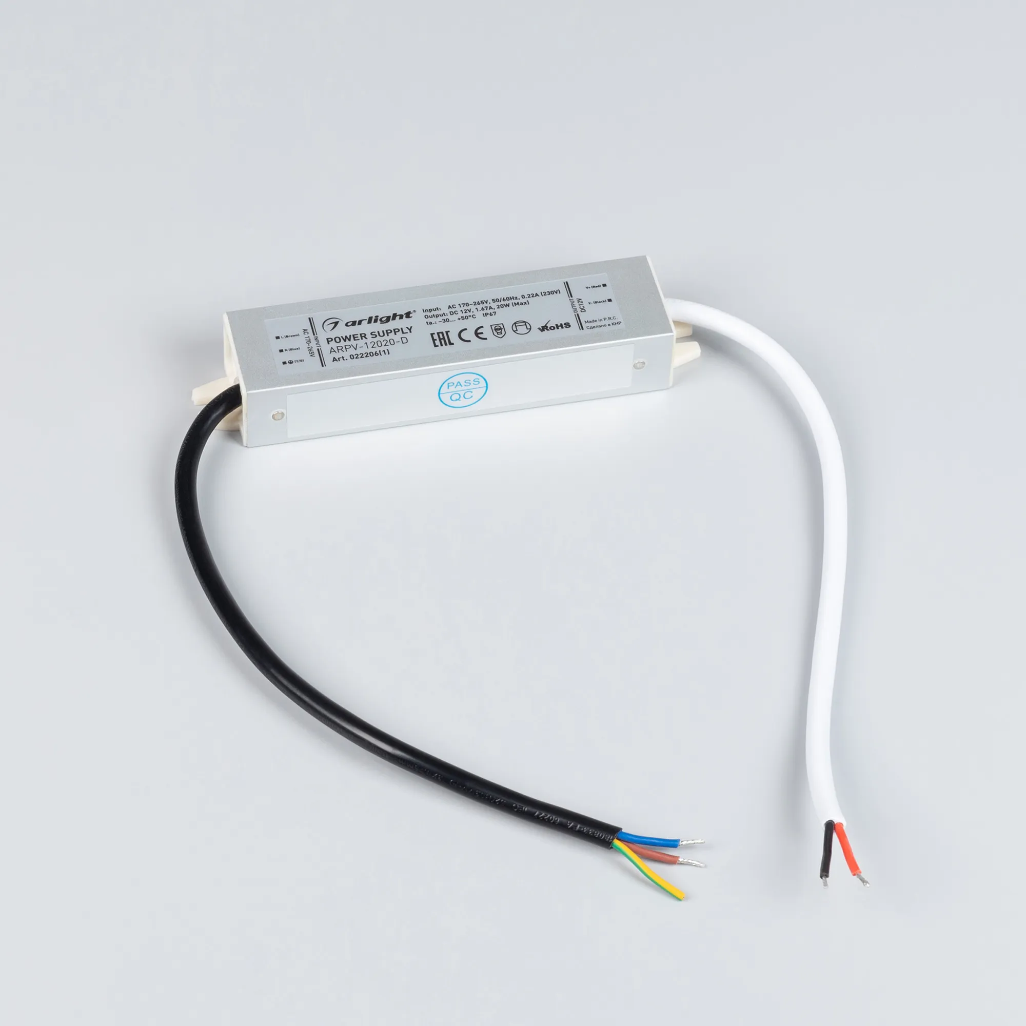 Источник напряжения с гальванической развязкой для светодиодных изделий. Входное напряжение 170-265 VAC. Выходные параметры: 12 В, 1,67 А, 20 Вт. Герметичный алюминиевый корпус IP 67. Рабочая температура -30…+50C⁰. Габаритные размеры длина 127 мм, ширина 30 мм, высота 20 мм. Гарантийный срок 3 года.