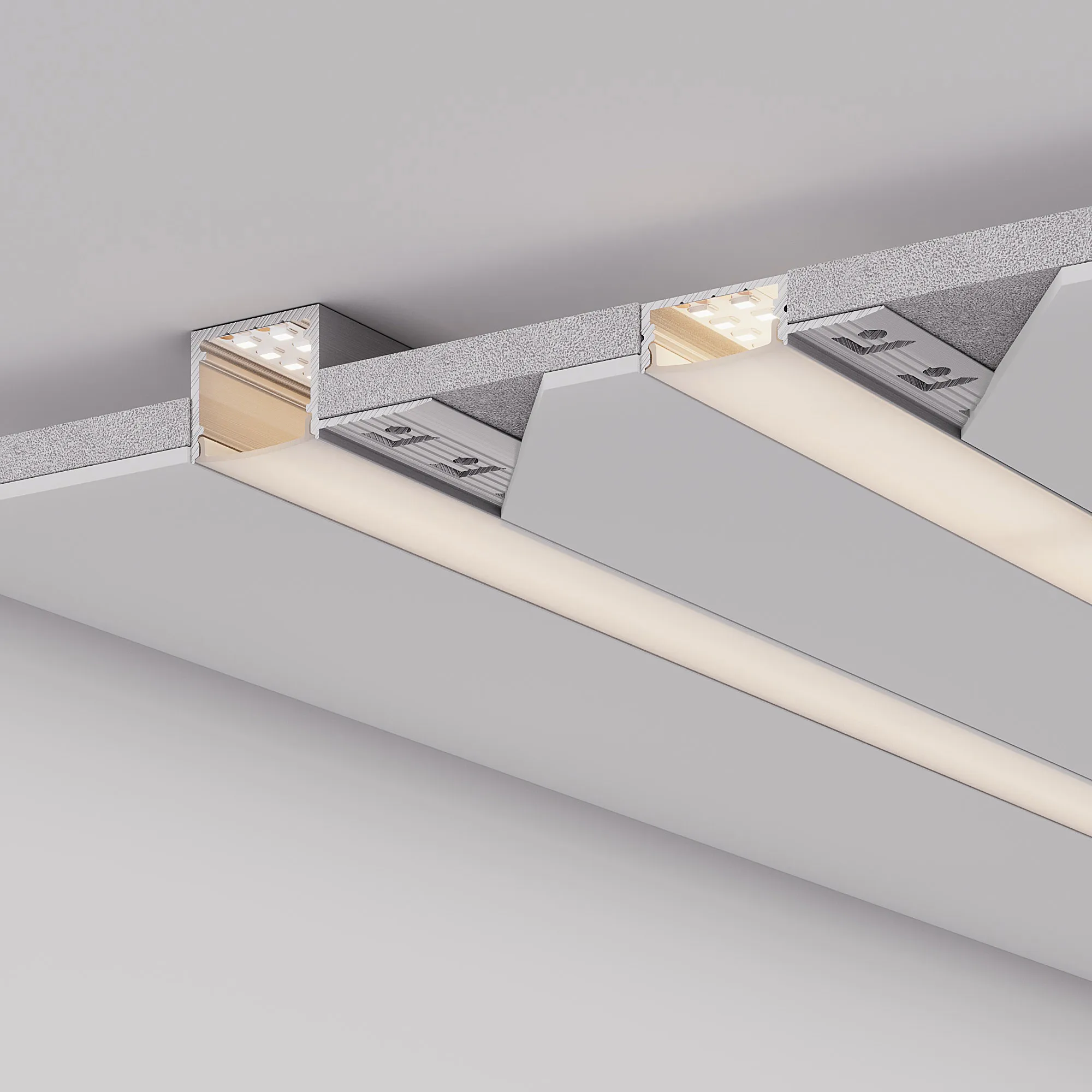 Алюминиевый профиль для светодиодных лент и линеек. Скрытая установка (под строительную отделку). Габаритные размеры (L×W×H): 2000x53,5x9,8 мм. Ширина площадки для ленты 18,9 мм. Экраны, заглушки и другие аксессуары приобретаются отдельно. Цена за 1 метр.