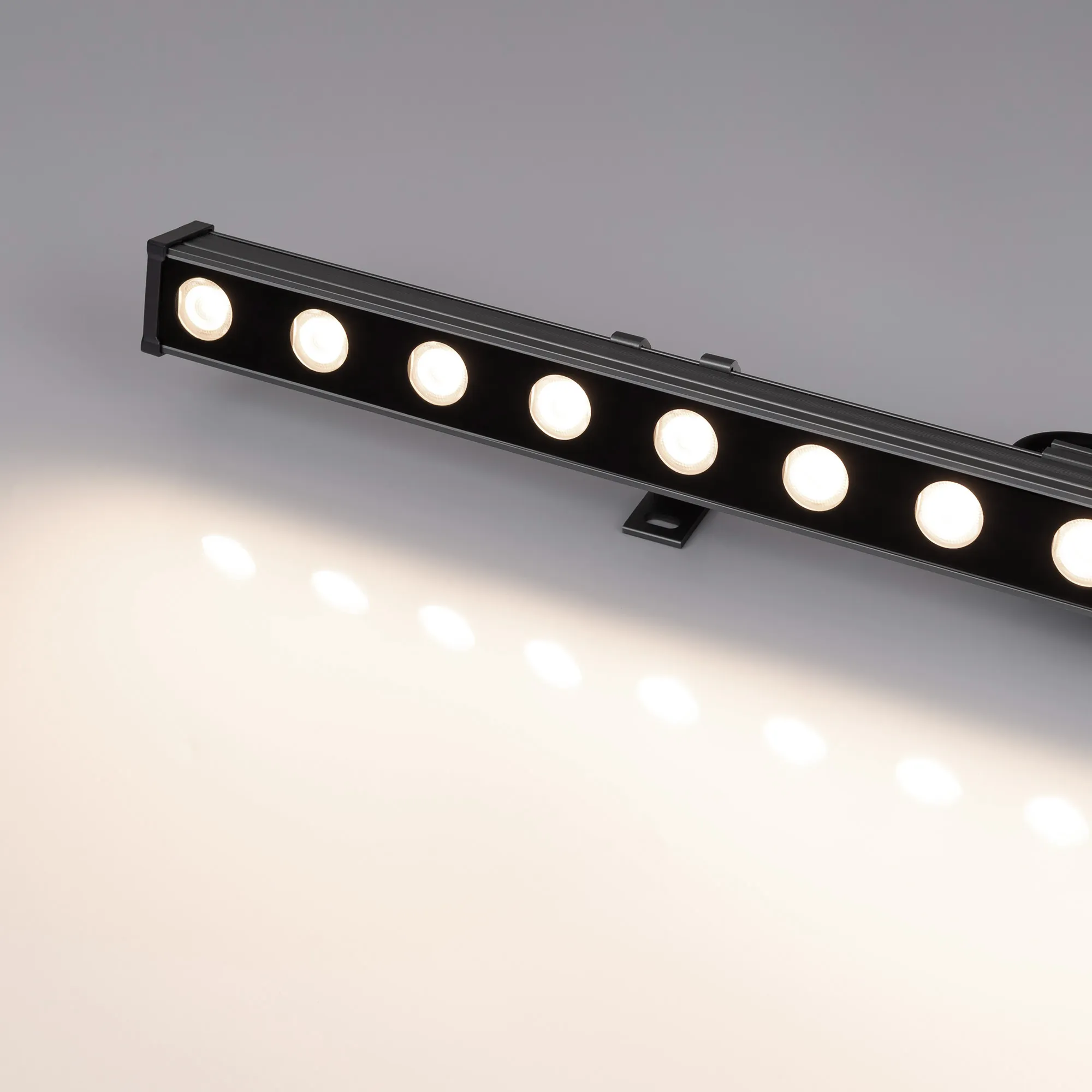 Линейный прожектор. Мощность 18 Вт, св. поток 1440 лм, 80 лм/Вт, дневной 4000 K, CRI>80, угол 15°, напряжение питания 230 В. Серый прямоугольный корпус из алюминия, экран стекло, степень защиты IP65. Размер: длина 760 мм, ширина 40 мм, высота 30 мм. Монтаж на кронштейнах.