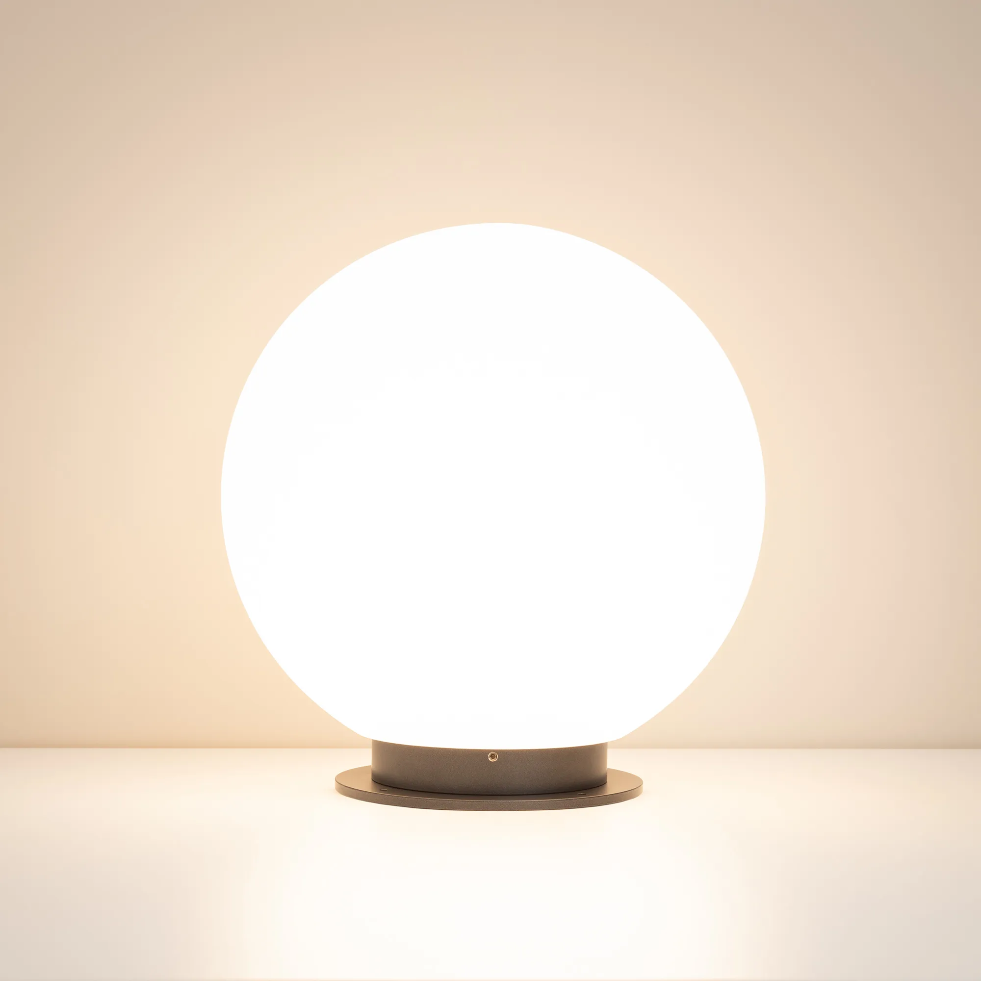 Декоративный ландшафтный светильник. Мощность 10 Вт, св. поток 900 лм, 90 лм/Вт, теплый 3000 K, CRI>80, угол 275°, напряжение питания 24 В. Белый светопропускающий сферический рассеиватель из LLDPE (линейный полиэтилен низкой плотности), основание из алюминия серого цвета, степень защиты IP65. Размер: диаметр 300 мм, высота 300 мм. Монтаж на твердую поверхность или в грунт с помощью двух оснований пик (входят в комплект поставки). Допускается регулирование светового потока ШИМ.