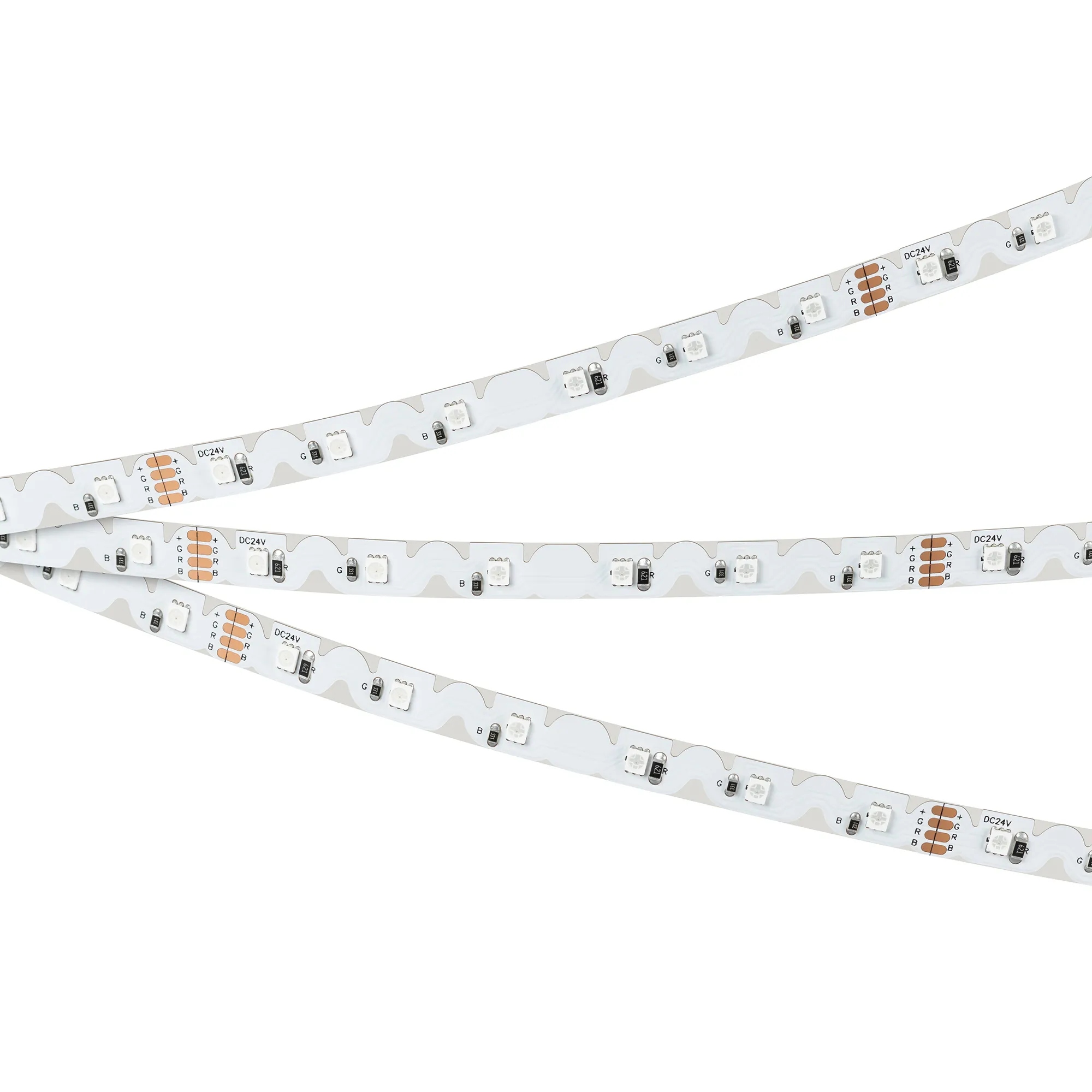 Гибкая лента серии RZ-A60 с фигурной платой в форме волны, легко изгибается на плоскости, открытая IP20. Светодиоды 2835, 60 шт/м (300шт на 5 м), белая плата, скотч 3М. Цвет RGB, угол 120°. Питание 24 В, мощность 8 Вт/м (40 Вт на 5 м). Размеры 5000x8x1.4 мм. Мин. отрезок 100 мм, 6 светодиодов. Цена за 1 м.