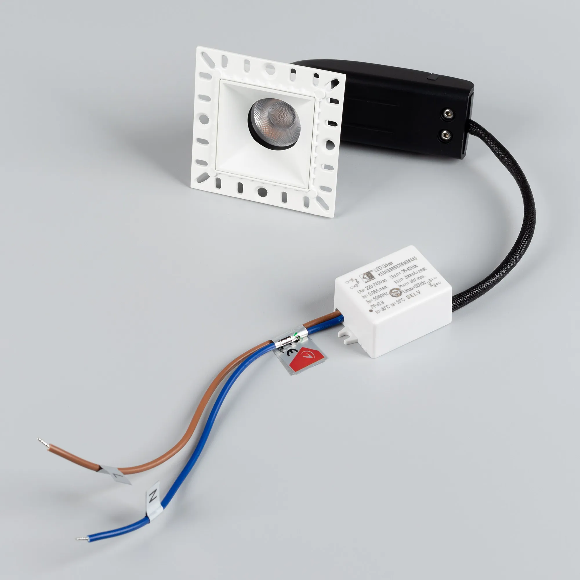 Встраиваемый безрамочный светильник под шпаклевку. Мощность 9 Вт, св. поток 720 лм, 80 лм/Вт, дневной 4000 K, CRI>90, угол 36°, напряжение питания 230 В. Белый квадратный корпус, экран PMMA, степень защиты IP20. Размер: длина 65 мм, ширина 65 мм, высота 63 мм, размер отражателя 40x40 мм. Монтаж встраиваемый, установочное отверстие длина 45 мм, ширина 45 мм. Драйвер 26-40 В, 200 мА, пульсация <2%.