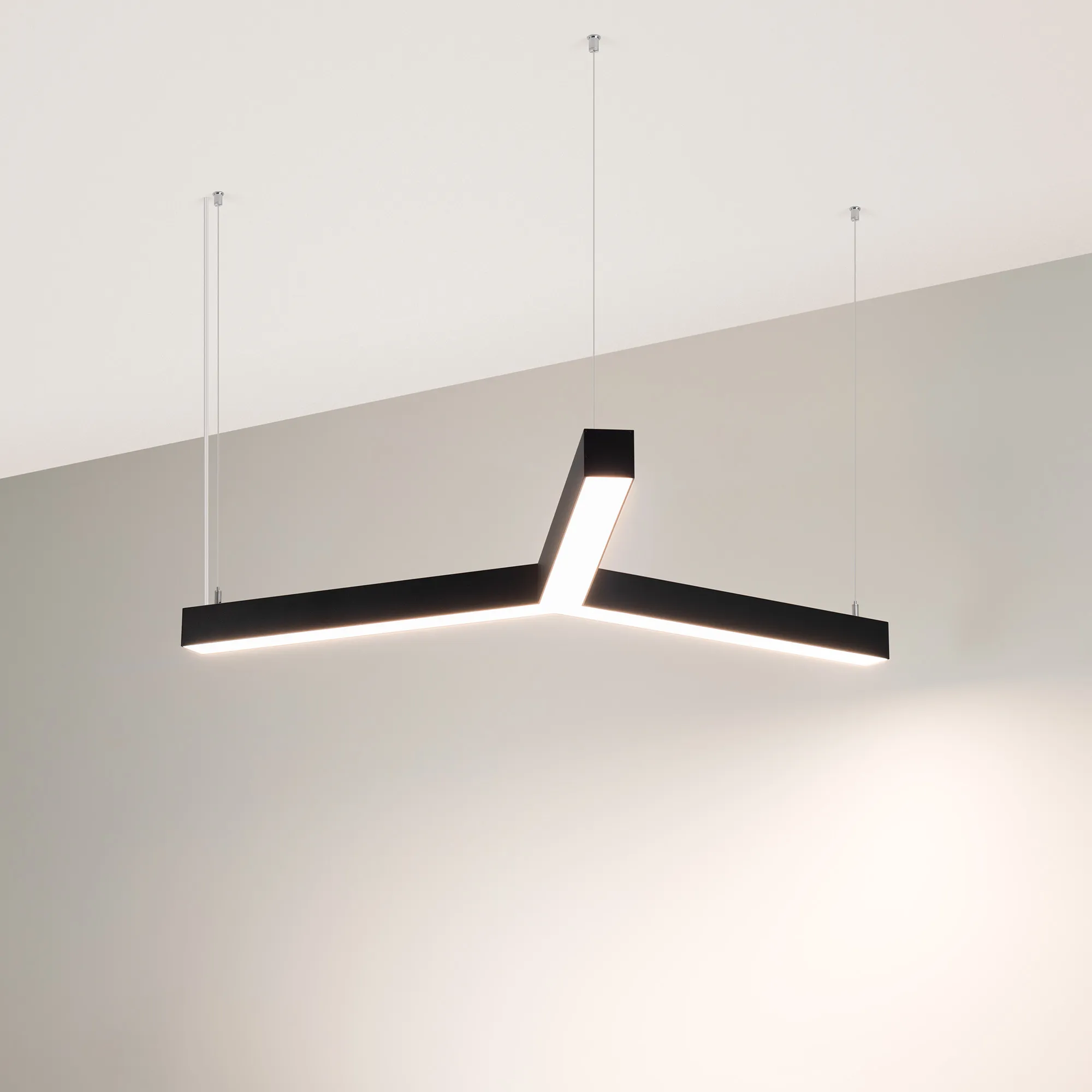 Светильник 3 ЛУЧА из профиля SL-LINE-5050-2000 ANOD, цвет Day4000K (Лента в 2 ряд(а)), световой поток - 1730 лм. Габаритные размеры светильника 790х910х50 мм (длина одного луча 510 мм), сечение профиля 50х50 мм. Способ установки - подвесной 2 м. Цвет корпуса - Черный RAL9005. Степень защиты IP33. Мощность 35 Вт, питание 170-265 В. В комплекте 1 встроенный блок питания, подвесы 2 м и кабель. Гарантия 3 год(а). Поставка в сборке.