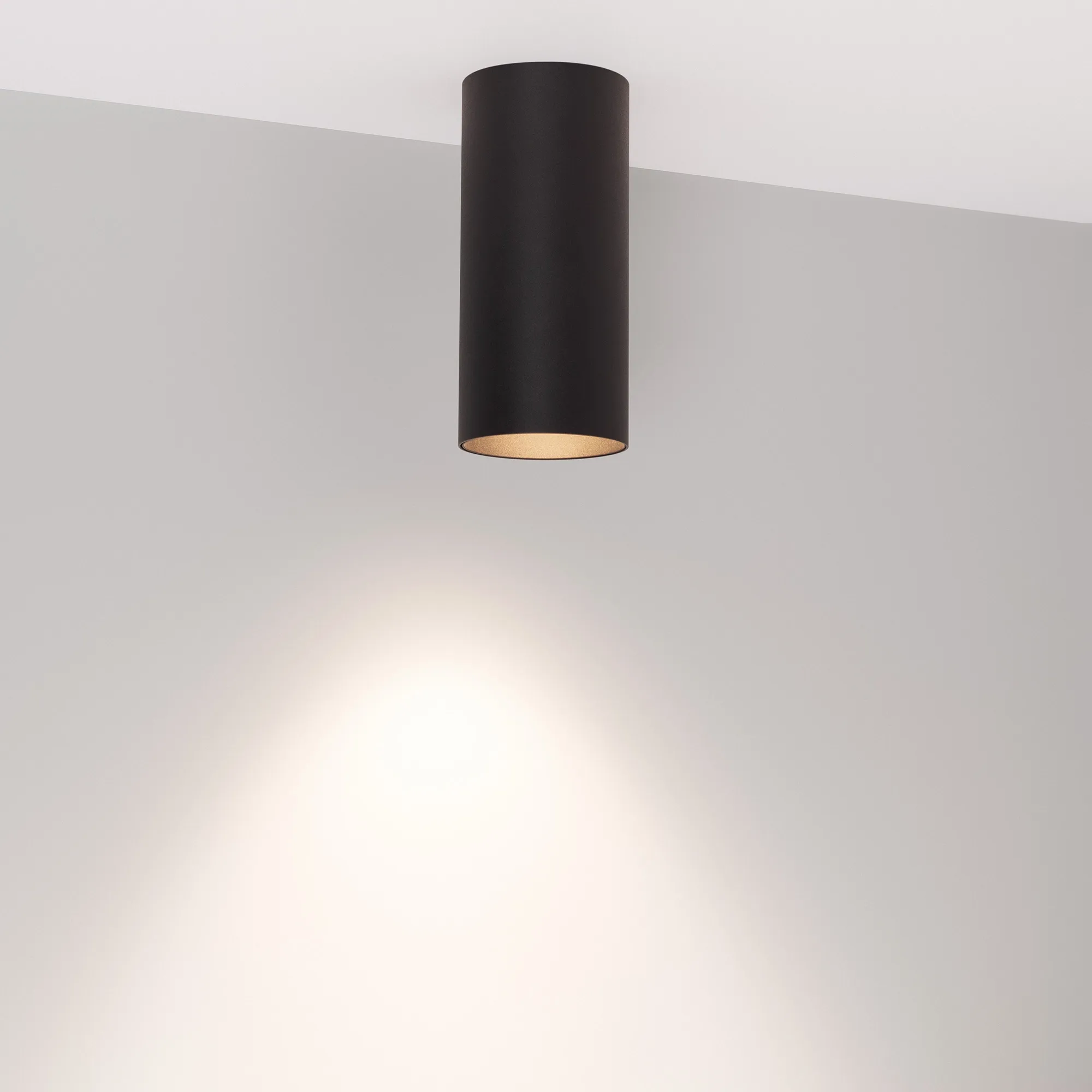 Накладной светильник. Мощность 12 Вт, св. поток 1200 лм, 100 лм/Вт, дневной 4000 K, CRI>90, угол 60°, напряжение питания 230 В. Чёрный круглый корпус из алюминия, экран PMMA, степень защиты IP40. Размер: диаметр 60 мм, высота 130 мм. Монтаж накладной. Встроенный драйвер 27-42 В, 300 мA, пульсация <1%.