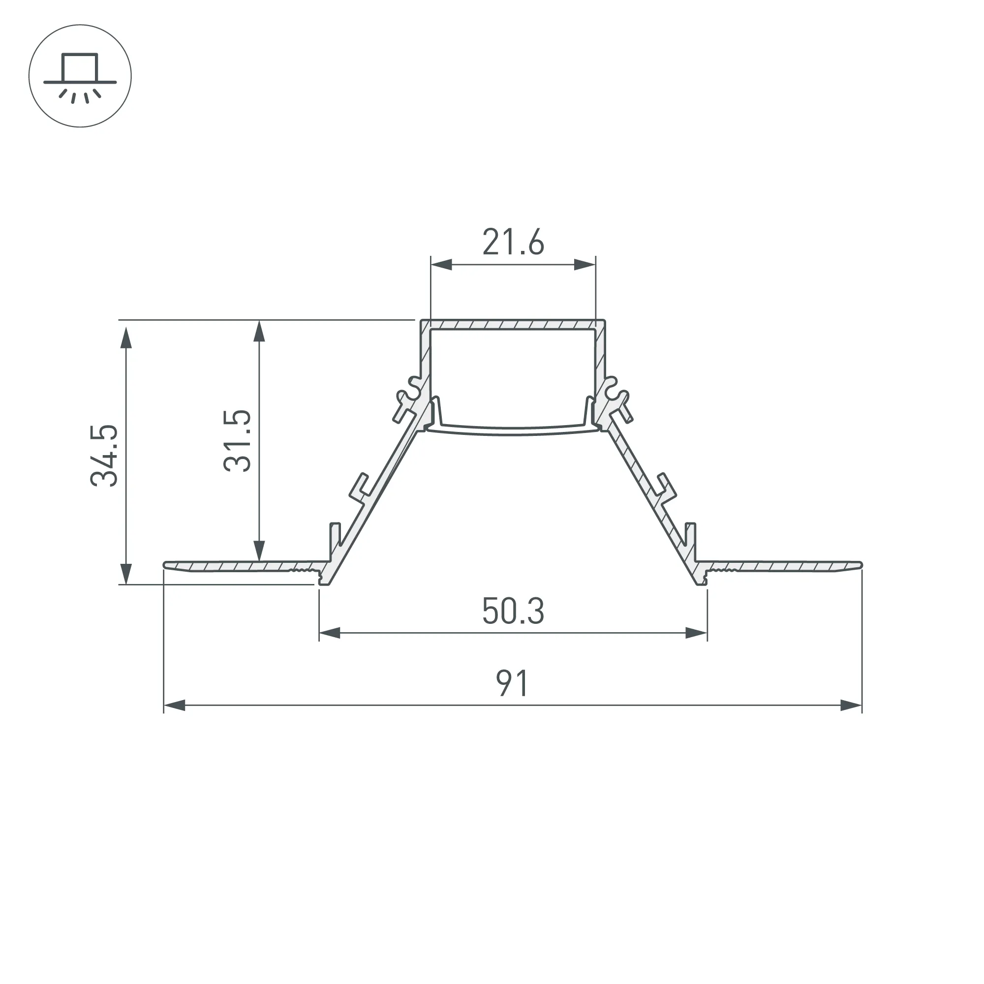 Алюминиевый профиль для светодиодных лент и линеек. Скрытая установка (под строительную отделку). Цвет - черный RAL9005 (порошковая окраска). Экран утоплен в плоскости профиля, что позволяет скрыть источник света от прямого контакта с глазами. Габаритные размеры (L×W×H): 2000x91x34,5 мм. Ширина площадки для ленты 21,6 мм. Экраны, заглушки и другие аксессуары приобретаются отдельно. Цена за 1 метр.