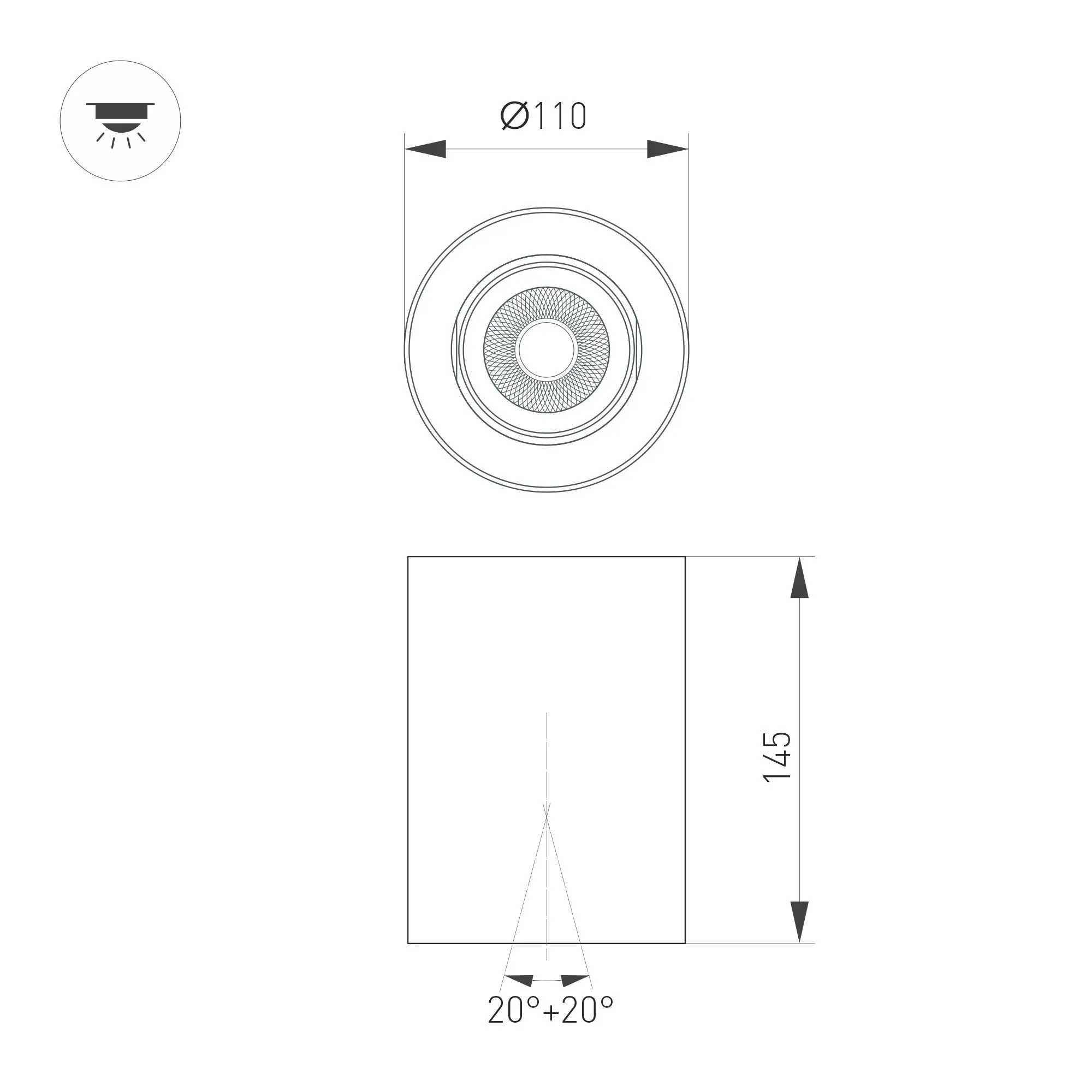 Накладной интерьерный светильник. Мощность 18 Вт, св. поток 1700 лм, 99 лм/Вт, теплый 3000 K, CRI>90, угол 15°, регулируемое направление луча 40°(20+20), поворотный световой модуль вокруг своей оси на 340°, UGR <11, напряжение питания 230 В. Белый круглый корпус из алюминия, степень защиты IP54. Размер: диаметр 110 мм, высота 145 мм. Монтаж накладной. Драйвер 27-43 В, 450 мА, пульсация <1%.