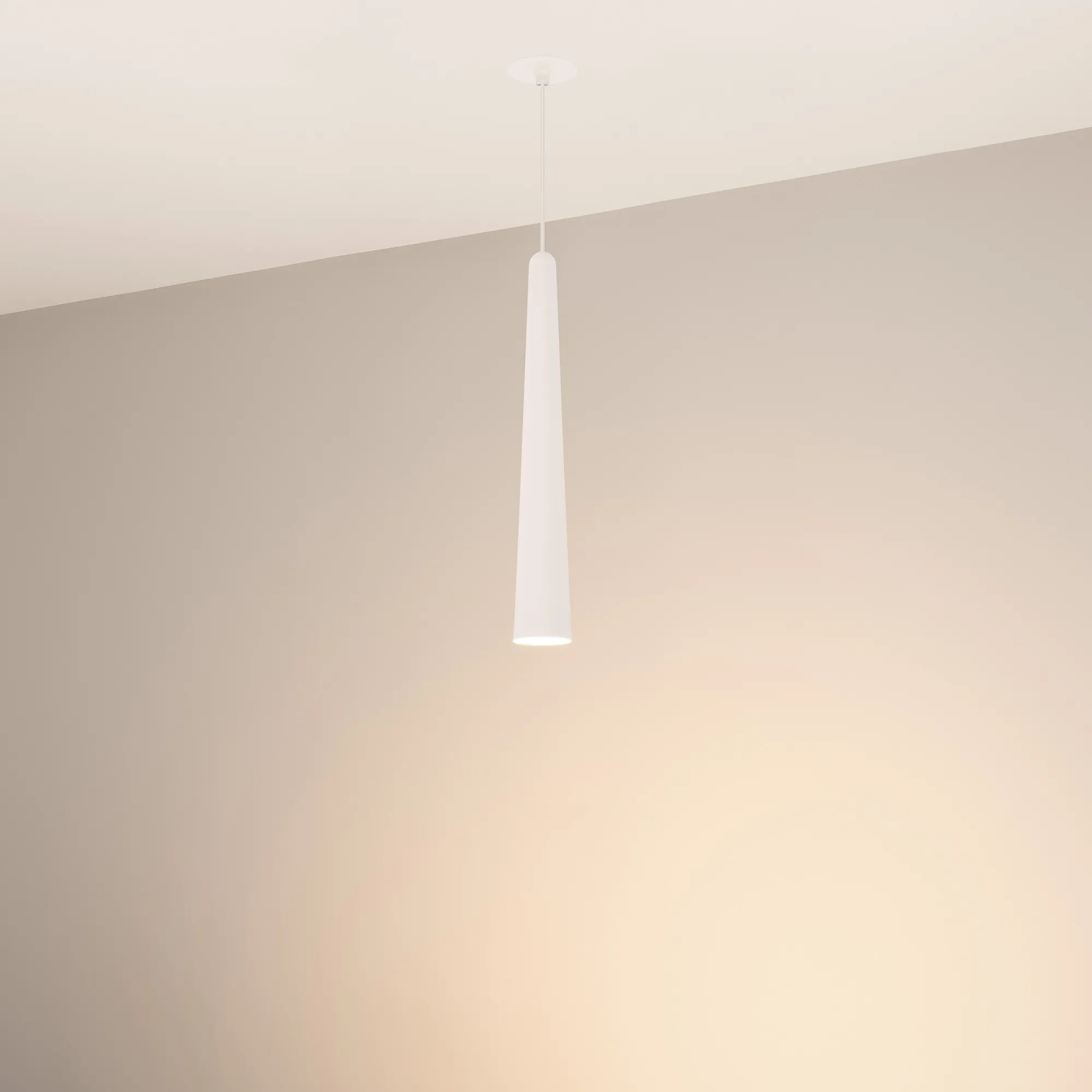 Подвесной светильник. Мощность 5 Вт, св. поток 400 лм, световая эффективность 70 лм/Вт, теплый 3000K, CRI>92, угол 36°, напряжение питания 230 В. Белый конусообразный вытянутый корпус из алюминия, линза из PMMA, степень защиты IP20. Размер: диаметр 57 мм, высота 400 мм. Монтаж подвесной, длина подвеса 2000 мм, регулируемая. В комплекте 2 вида чаш. Габариты встраиваемой чаши: Ø 80x41 мм. Габариты накладной чаши Ø80x60 мм. Драйвер 2,8-12В, 500 мА, пульсация <1%.