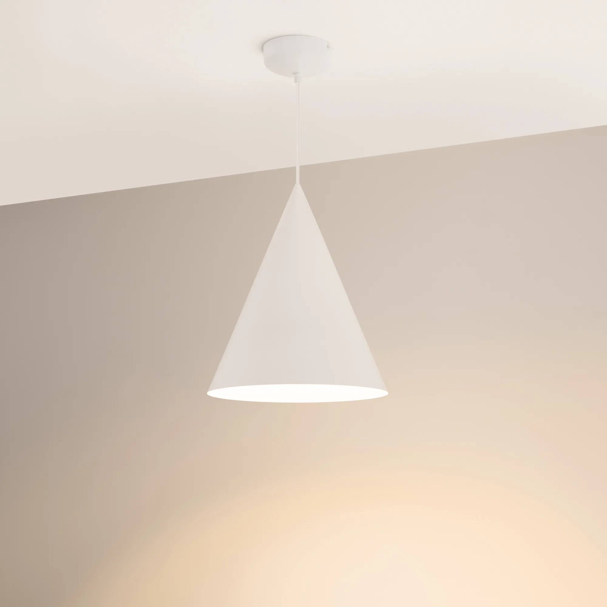 Подвесной светильник. Мощность 14 Вт, св. поток 1200 лм, 87 лм/Вт, теплый 2700 K, CRI>97, угол 36°, напряжение питания 230 В. Белый корпус из алюминия в форме конуса с белой внутренней поверхностью, линза-рассеиватель из PMMA, степень защиты IP20. Размер: диаметр 350 мм, высота 420 мм. Монтаж подвесной, длина подвеса 2000 мм, регулируемая. В комплекте 2 вида чаш. Габариты встраиваемой чаши: Ø 80x23 мм. Габариты накладной чаши Ø140x55 мм. Драйвер 27-42 В, 350 мА, пульсация <1%. Управление по TRIAC.