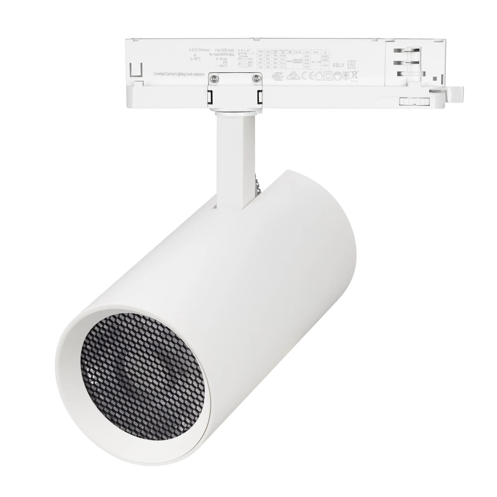 Светильник для треков/шин 4 провода. Мощность 40Вт, св. поток без решетки honeycomb 4000 лм, 100 лм/Вт, с решеткой honeycomb 2640 лм, 66 лм/Вт, теплый 3000 K, CRI>90, угол 24°, напряжение питания 230 В. Белый круглый корпус из алюминия, материал линзы PMMA, степень защиты IP20. Размер: диаметр 90 мм, длина световой части 141 мм. Монтаж на трек 3-фазный. Драйвер встроенный 24-42 В, 750мА., пульсация <5%