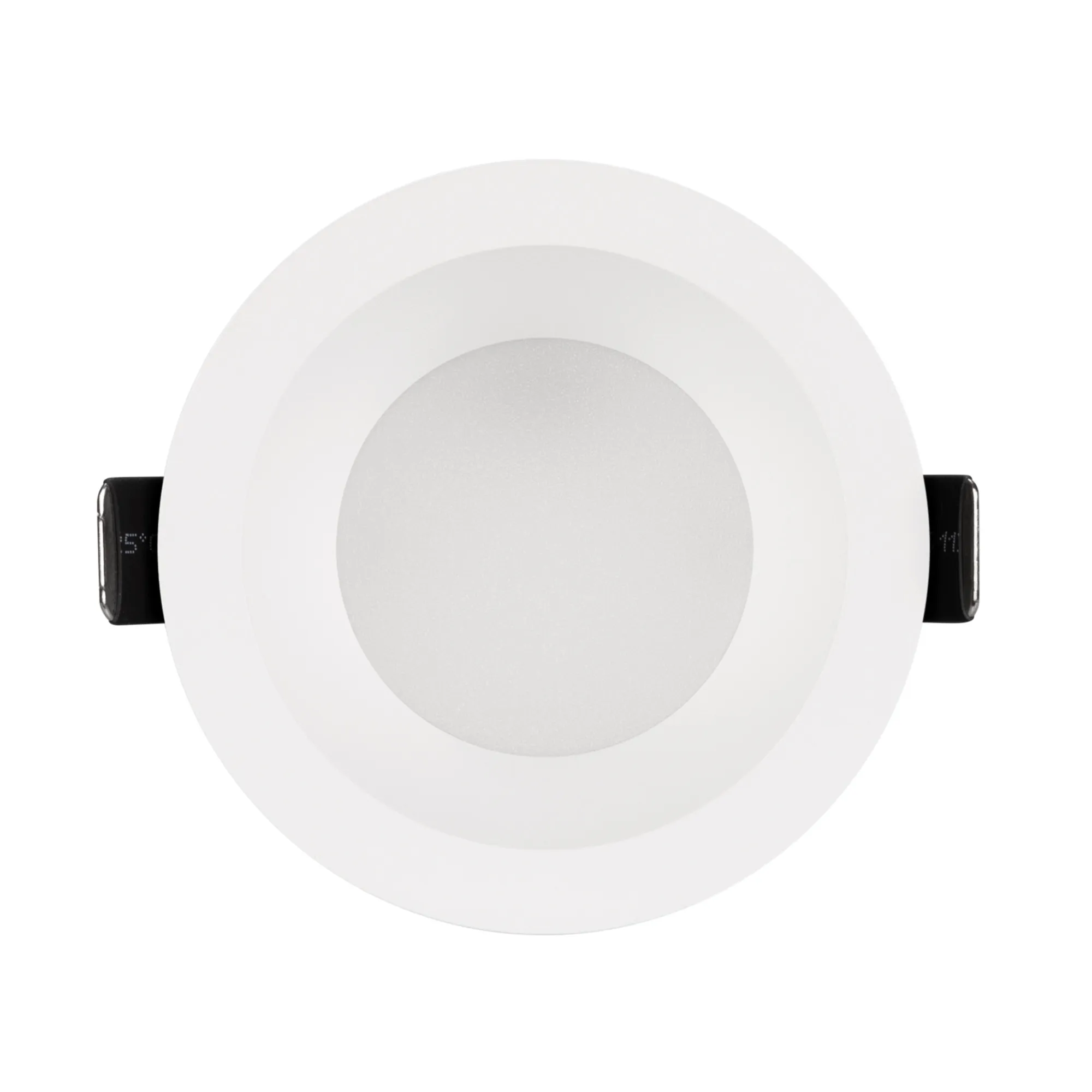 Встраиваемый светильник даунлайт. Мощность 8 Вт, св. поток 610 лм, 76 лм/Вт, тёплый 2700 K, CRI>90, угол 85°, напряжение питания 230 В. Белый круглый корпус из алюминия, степень защиты IP54. Размер: диаметр 84 мм, высота 49 мм. Монтаж встраиваемый, установочное отверстие: диаметр 75 мм. Драйвер 30-45 В, 200 мА, пульсация <3%.