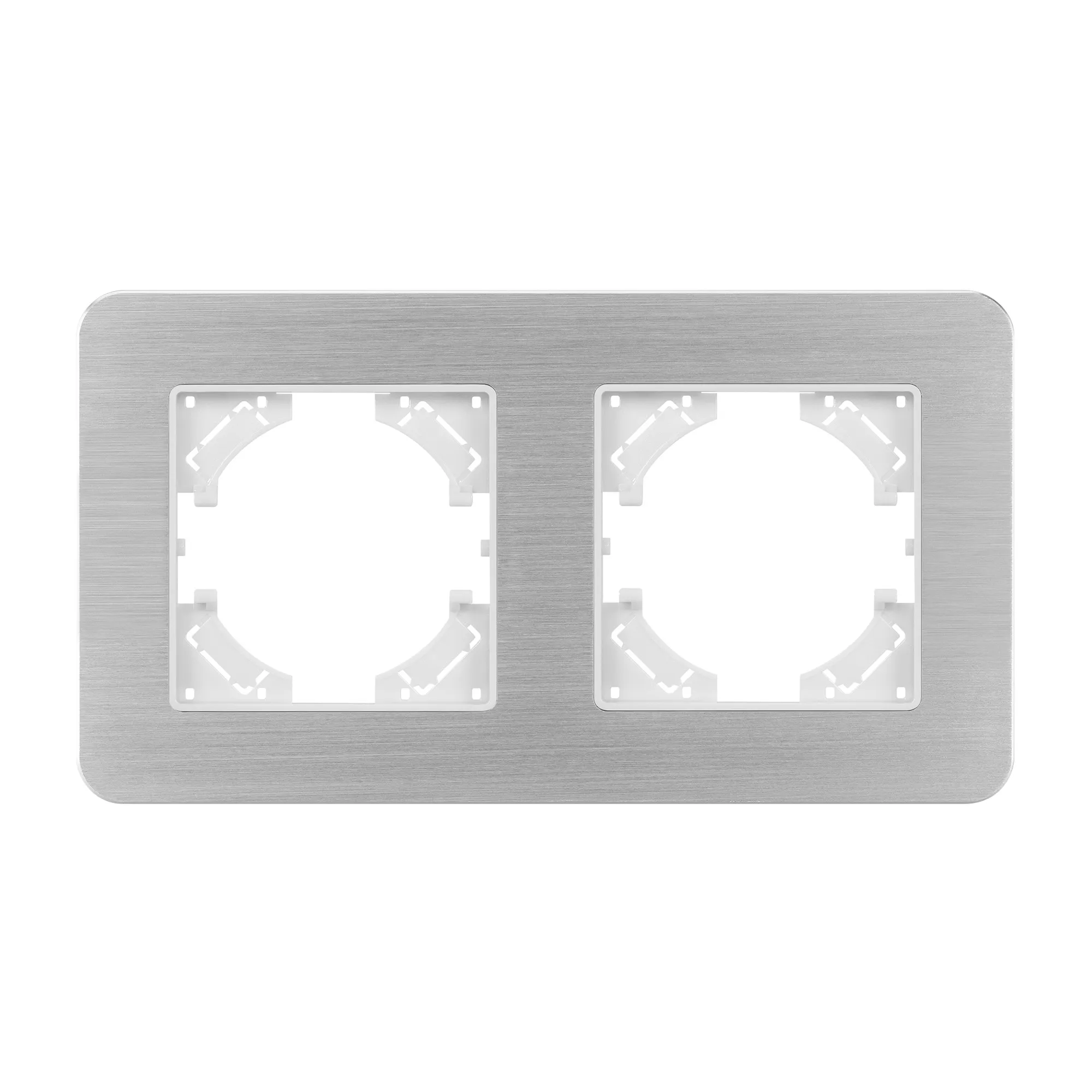 Рамка алюминиевая на 2 поста, под встраиваемый механизм. Цвет - серебристый. Уровень герметичности IP20. Ориентация монтажа - горизонтальная (основным ориентиром служат посадочные выступы для накладки механизма).