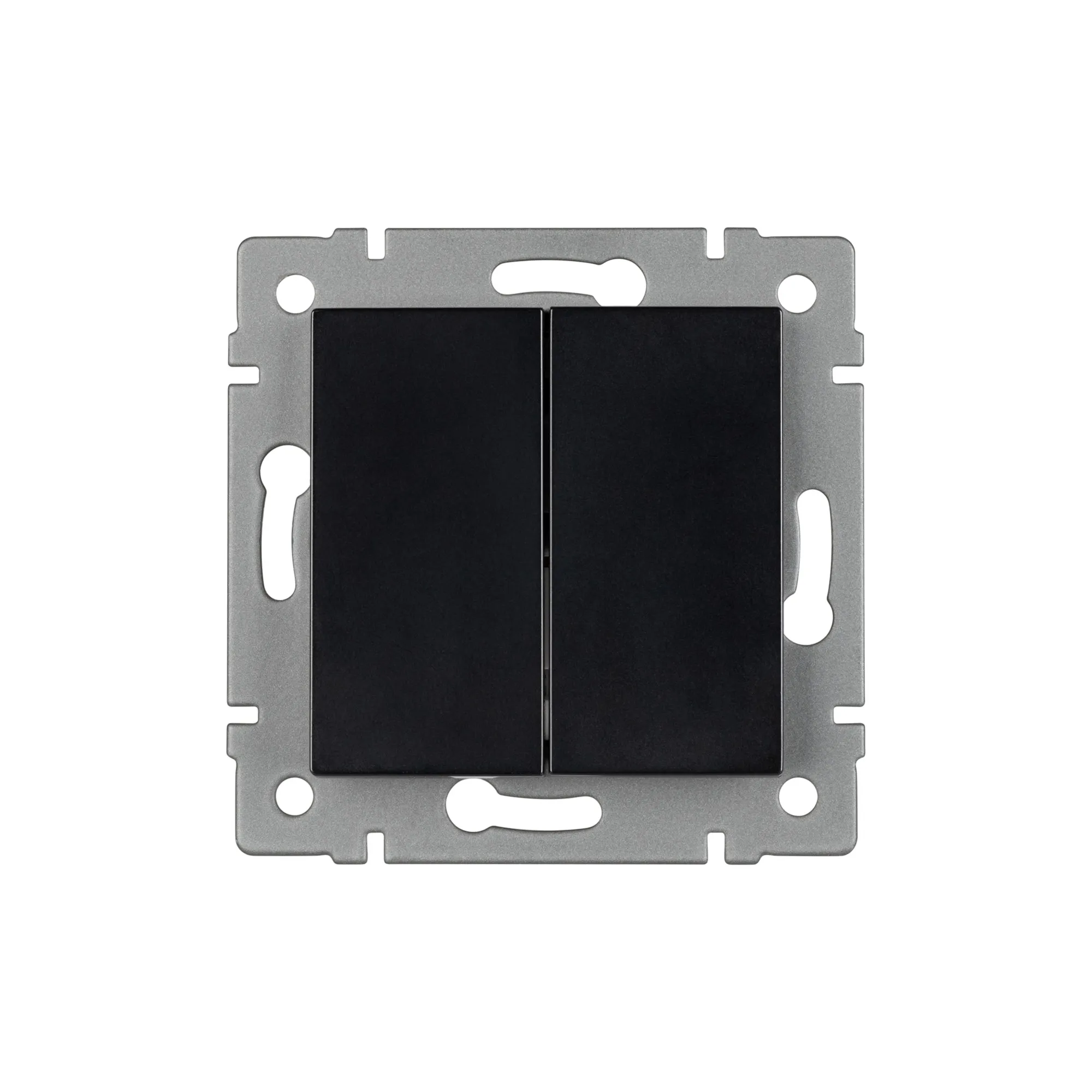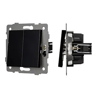 Механизм выключателя света клавишный на 1 пост 2 клавиши (непроходной). Цвет - черный. Без фронтальной рамки. Уровень пылевлагозащиты IP20. Выключатель устанавливается в стандартный круглый подрозетник.