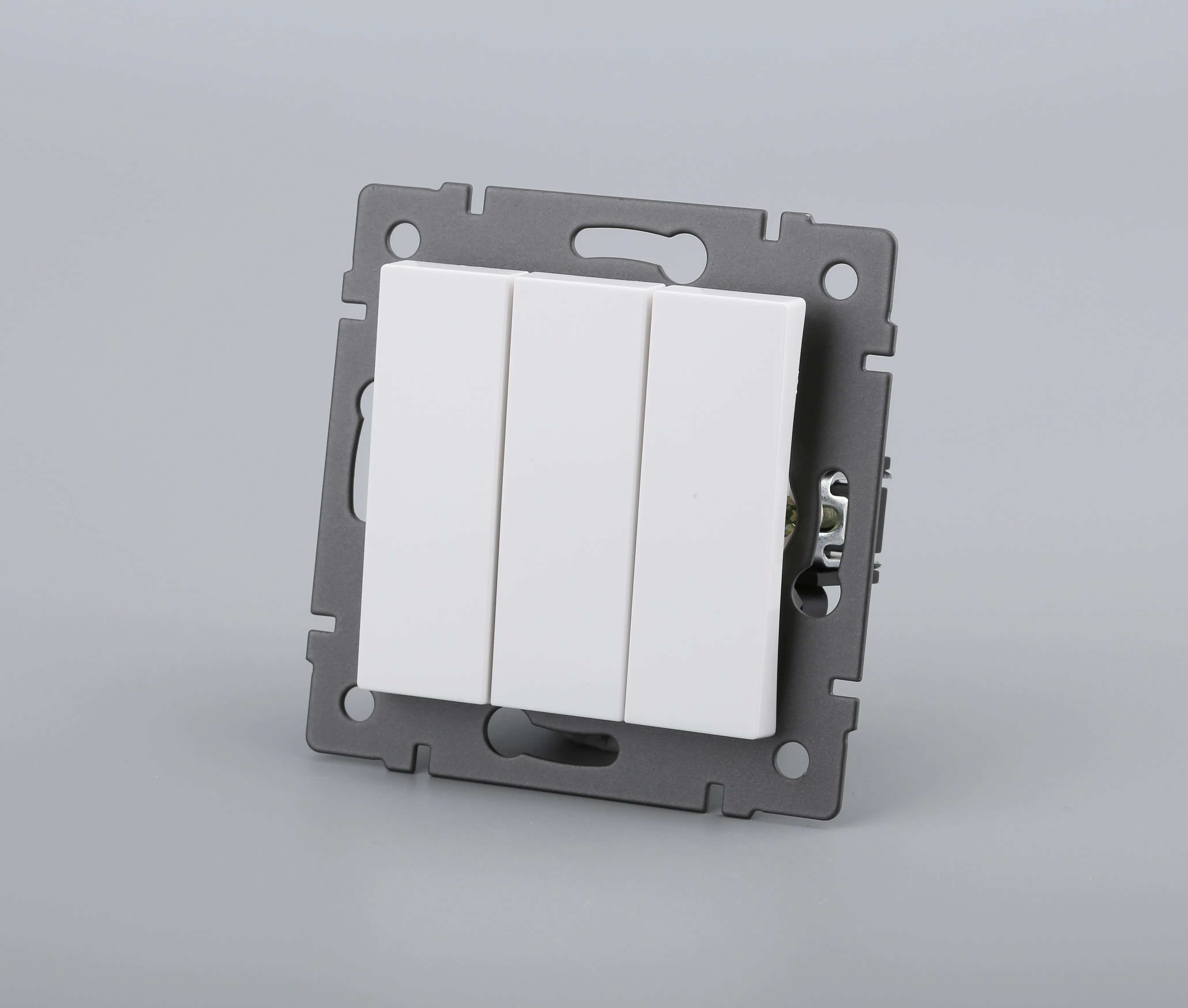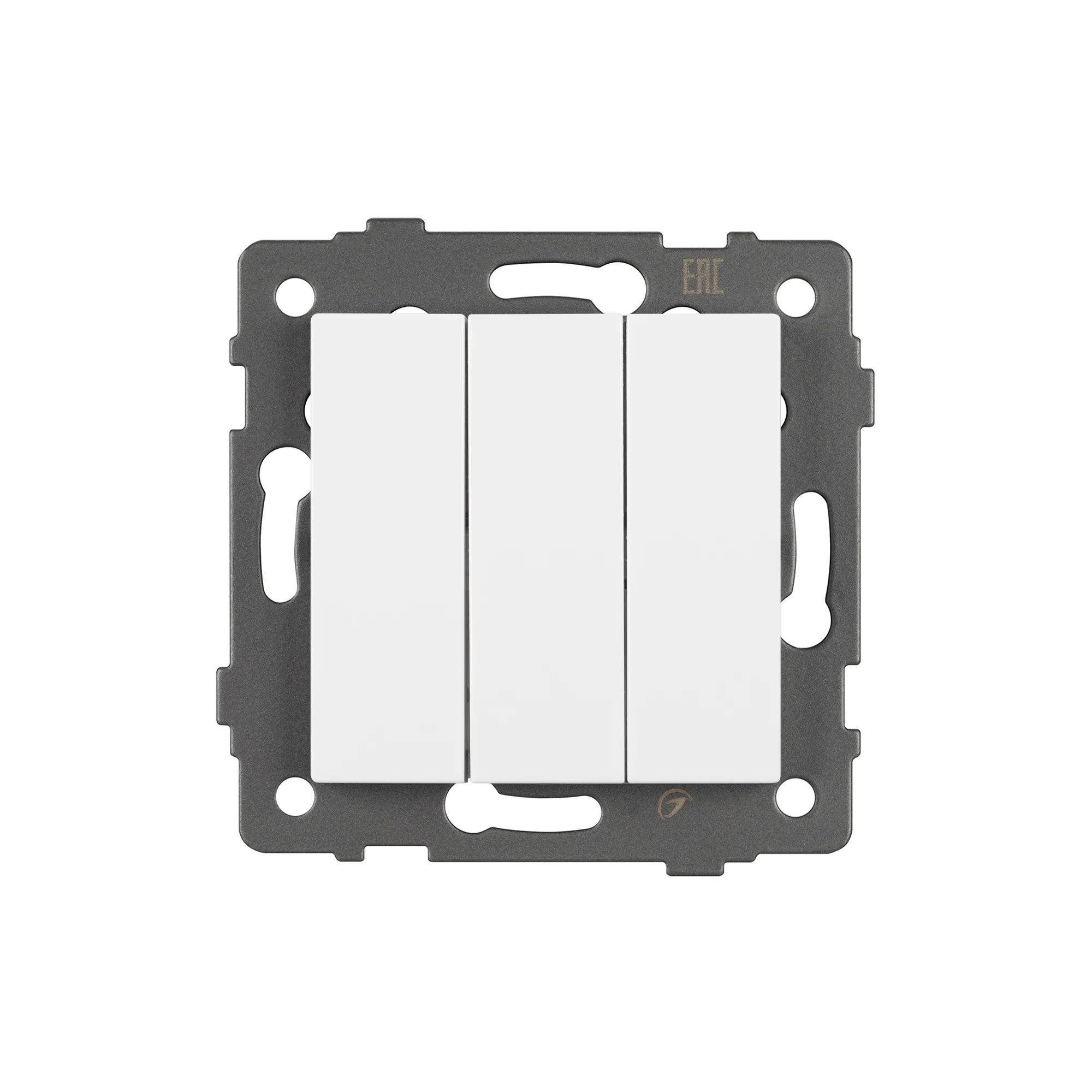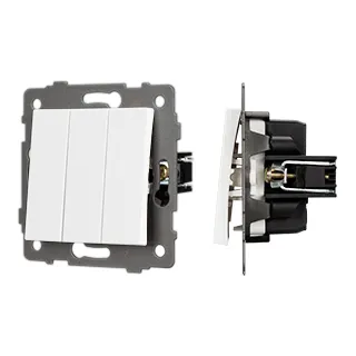 Механизм выключателя света клавишный на 1 пост 3 клавиши (непроходной). Цвет - белый. Без фронтальной рамки. Уровень пылевлагозащиты IP20. Выключатель устанавливается в стандартный круглый подрозетник.