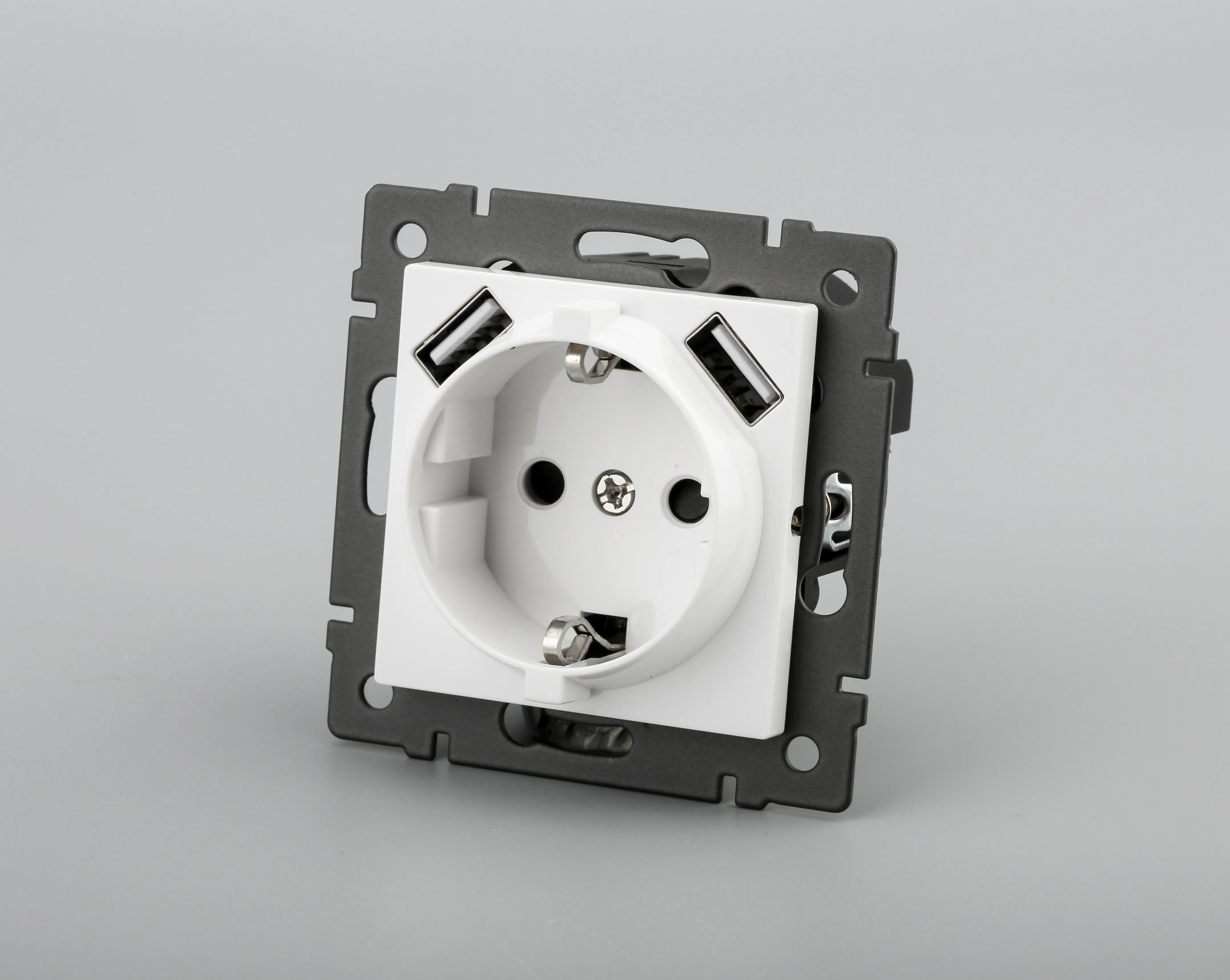 Механизм розетки с заземлением на 1 пост и 2USB Type A порта. Цвет - белый. Без фронтальной рамки. Уровень пылевлагозащиты IP20. Устанавливается в стандартный подрозетник.