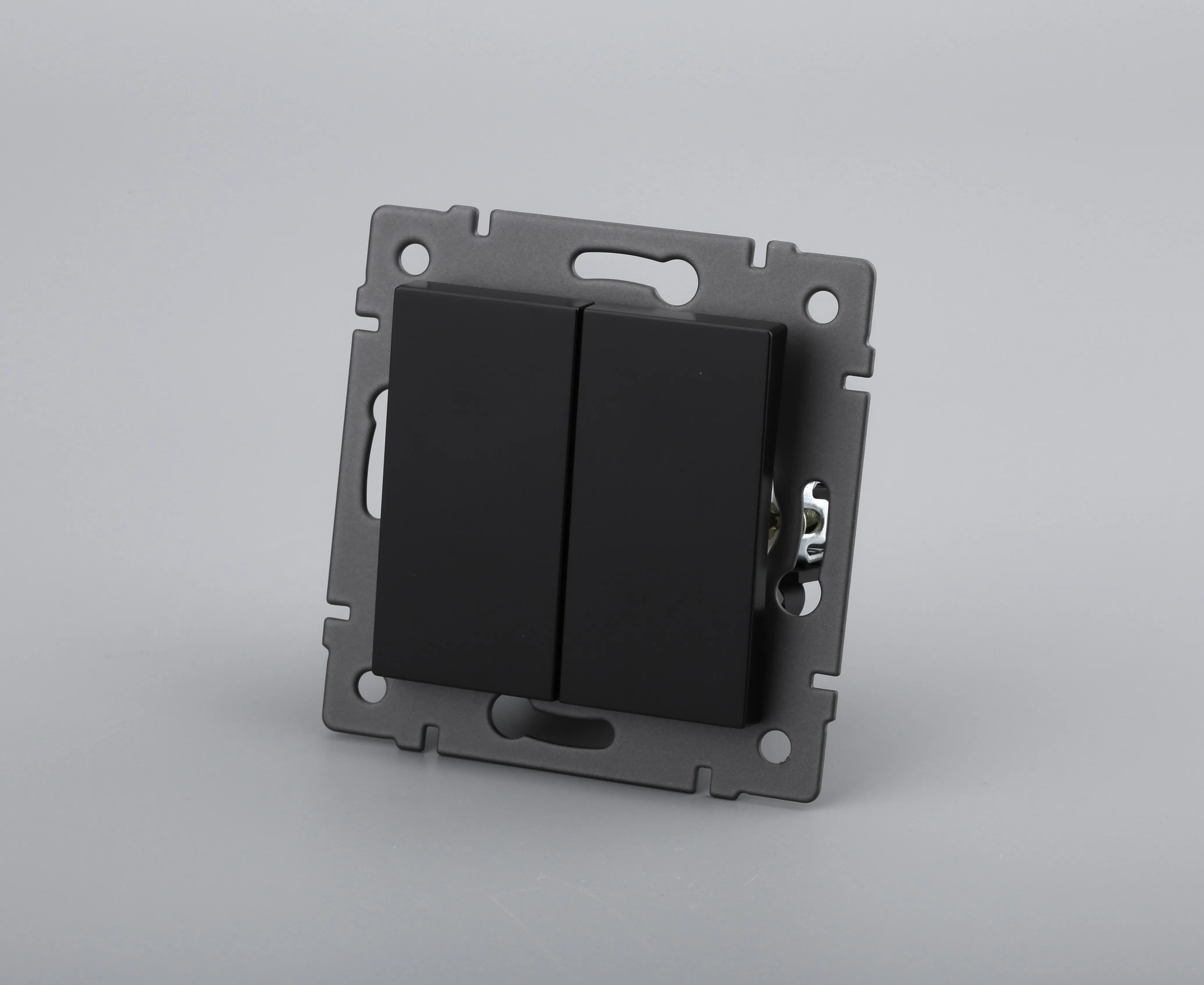 Механизм выключателя света клавишный на 1 пост 2 возвратные клавиши. Цвет - черный. Без фронтальной рамки. Уровень пылевлагозащиты IP20. Выключатель устанавливается в стандартный круглый подрозетник.