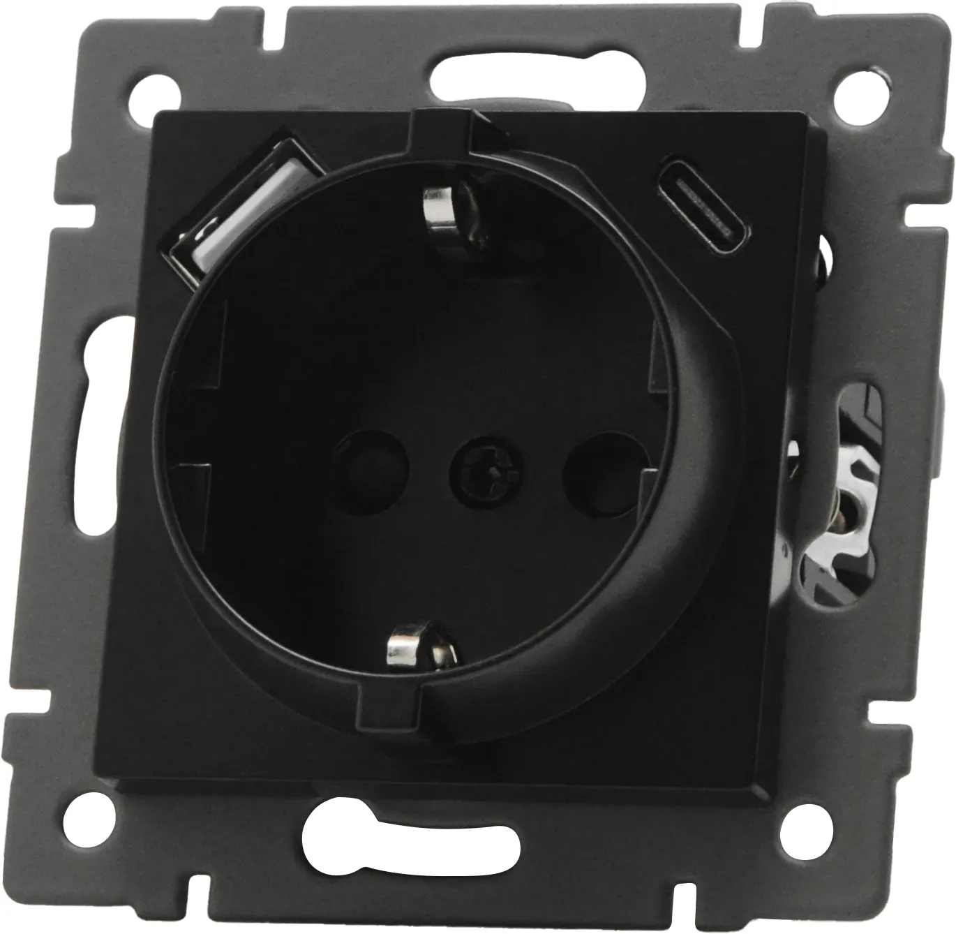 Механизм розетки с заземлением 1 пост 2 USB Type A+C порта. Цвет - черный. Без фронтальной рамки. Уровень пылевлагозащиты IP20. Устанавливается в стандартный подрозетник.