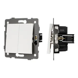 Механизм выключателя света клавишный на 1 пост 2 клавиши (проходной). Цвет - белый. Без фронтальной рамки. Уровень пылевлагозащиты IP20. Выключатель устанавливается в стандартный круглый подрозетник.