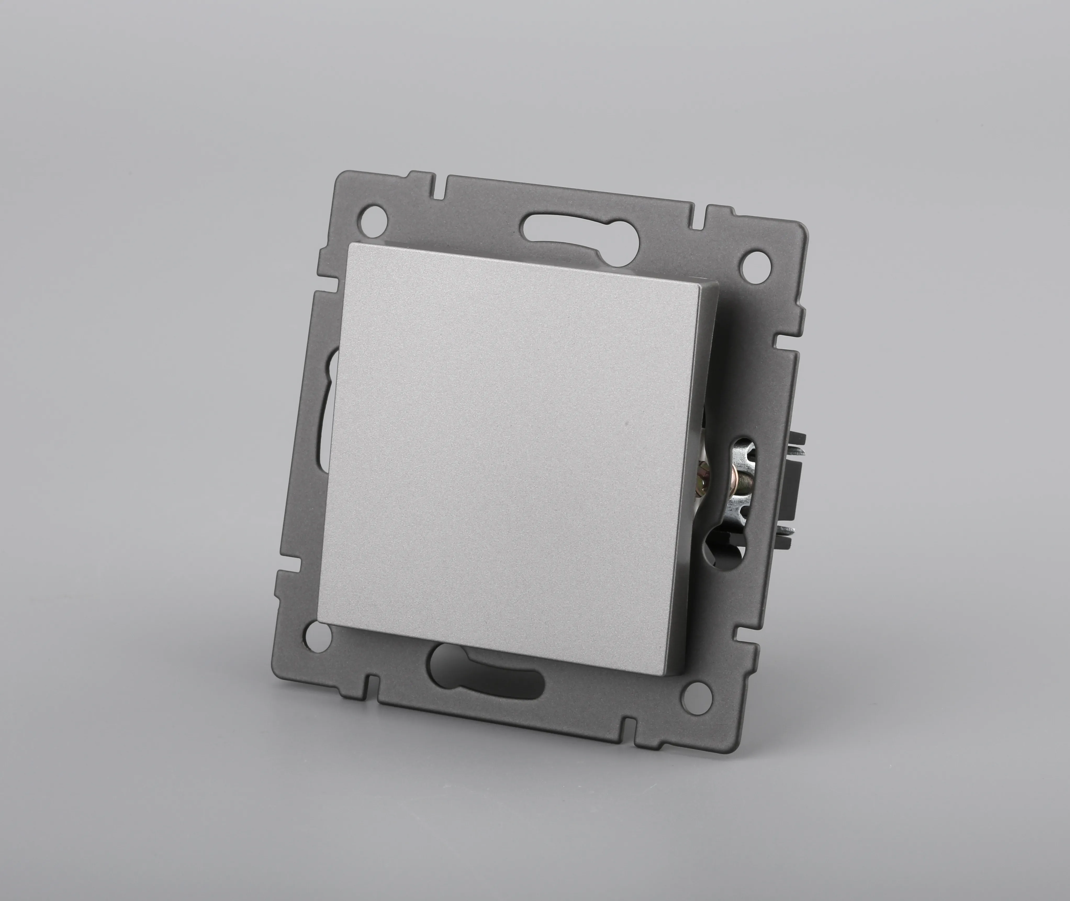 Механизм выключателя света клавишный на 1 пост 1 возвратная клавиша. Цвет - серый. Без фронтальной рамки. Уровень пылевлагозащиты IP20. Выключатель устанавливается в стандартный круглый подрозетник.