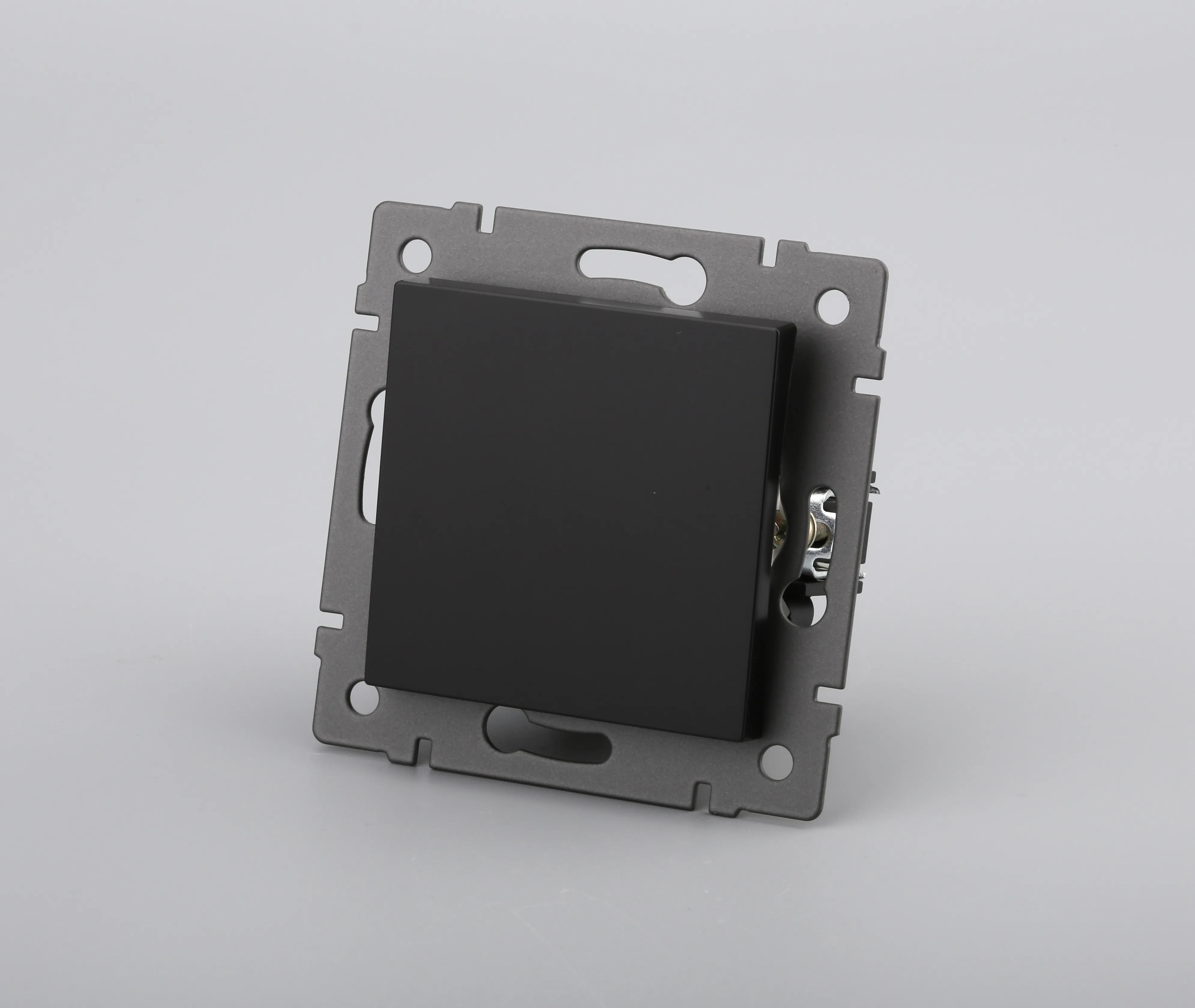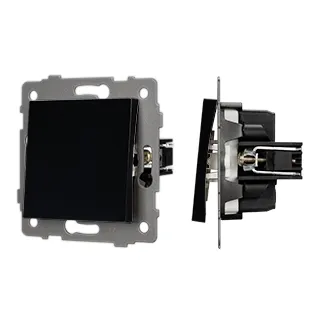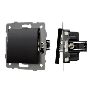 Механизм выключателя света клавишный на 1 пост 1 клавиша (проходной). Цвет - черный. Без фронтальной рамки. Уровень пылевлагозащиты IP20. Выключатель устанавливается в стандартный круглый подрозетник.