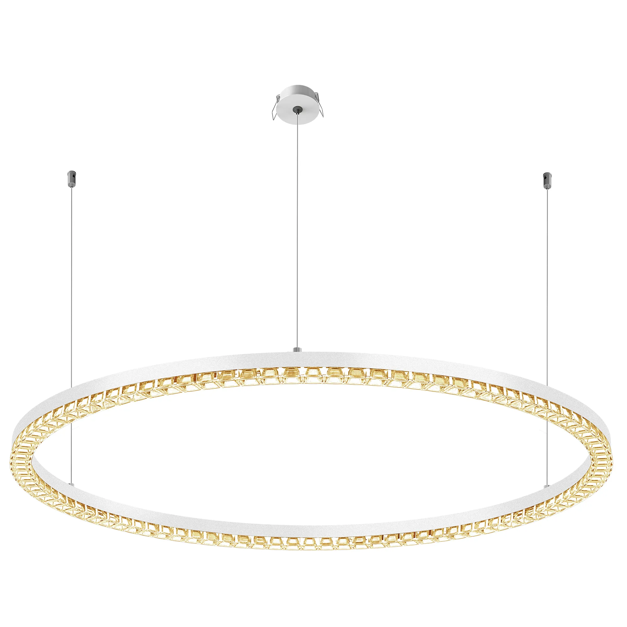 Под заказ. Подвесной светильник. Мощность 60 Вт, св. поток 5070 лм, 80-95 лм/Вт, теплый 3000 K, CRI>90, угол 45°, напряжение питания 230 В. Белый круглый корпус из алюминия, экран PMMA, степень защиты IP20. Размер: диаметр 1050 мм, высота 34 мм, ширина профиля 30 мм, размер чаши: диаметр 65 мм, высота 26 мм. Монтаж подвесной, длина подвеса 1200 мм, тип чаши встраиваемый, диаметр установочного отверстия чаши 60 мм. Драйвер (2шт.) 9-42 В, 700 мА. Пульсация <0,3 %.