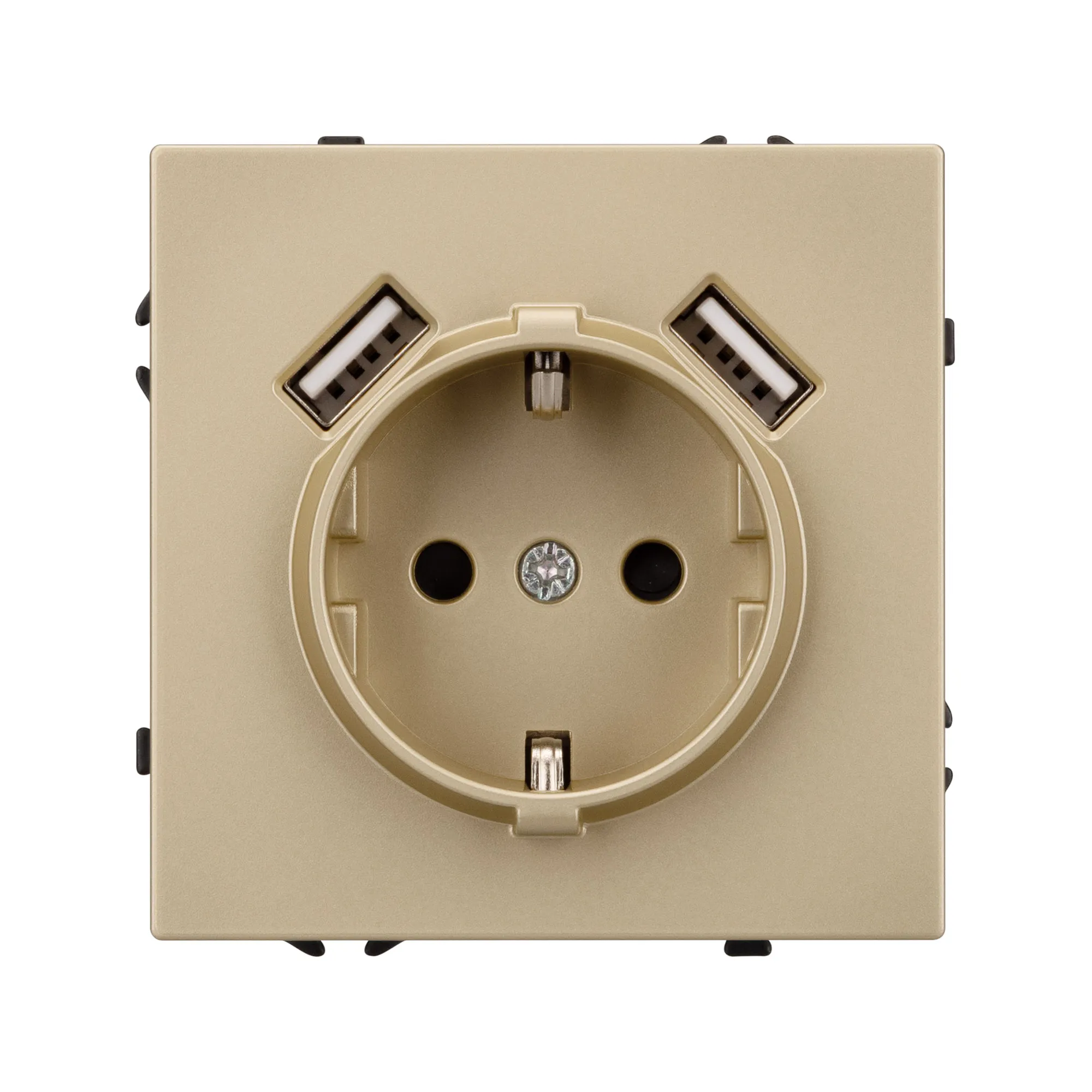 Механизм розетки с заземлением на 1 пост и 2USB Type A порта. Цвет - золотой песок, с Soft-Touch покрытием. Без фронтальной рамки. Уровень пылевлагозащиты IP20. Розетка устанавливается в стандартный подрозетник круглого сечения диаметром 60мм.