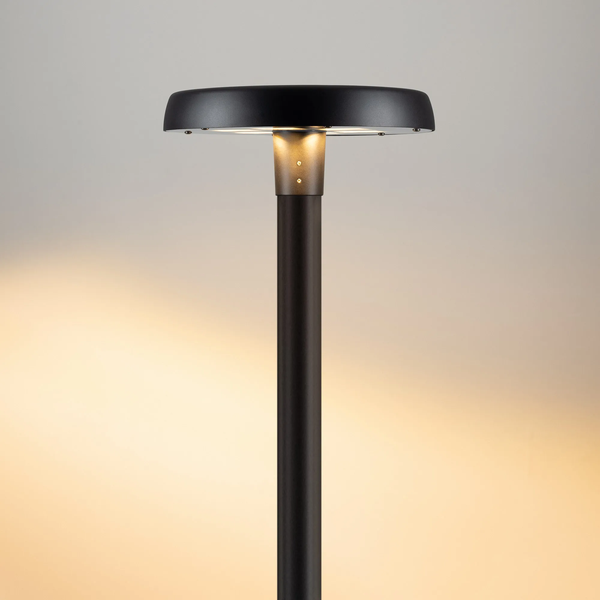 Венчающий светодиодный светильник. Мощность 50 Вт, св. поток 5680 лм, 112 лм/Вт, тёплый 3000 K, CRI>80, угол 140°, напряжение питания 230 В. Черный корпус из алюминия, экран закаленное стекло, степень защиты IP65. Размер: диаметр 510 мм, высота 200 мм. Монтаж на вертикальную опору диаметром 76 мкакой материал м.