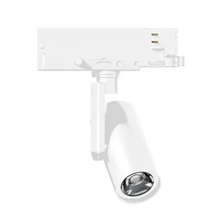Светильник для треков/шин 4 провода, 18Вт. Управление и изменение цветовой температуры по протоколу DALI. Цвет свечения меняется в диапазоне 2700К - 4000К, световой поток при 2700К - 1120лм, при 4000К - 1300лм, 62лм/Вт, угол 20°, CRI>95. Корпус круглый, алюминий, цвет белый, IP20. Размеры Ø65x190x220 мм. Входное напряжение AC220-240V, мощность 18Вт. Драйвер встроенный (8-40В, 450мА), пульсация <0.3%