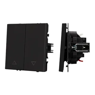 Механизм выключателя управления шторами на 1 пост 2 перекидные клавиши. Цвет - черный, с Soft-Touch покрытием. Без фронтальной рамки. Уровень пылевлагозащиты IP20. Выключатель устанавливается в стандартный круглый подрозетник круглого сечения диаметром 60мм.