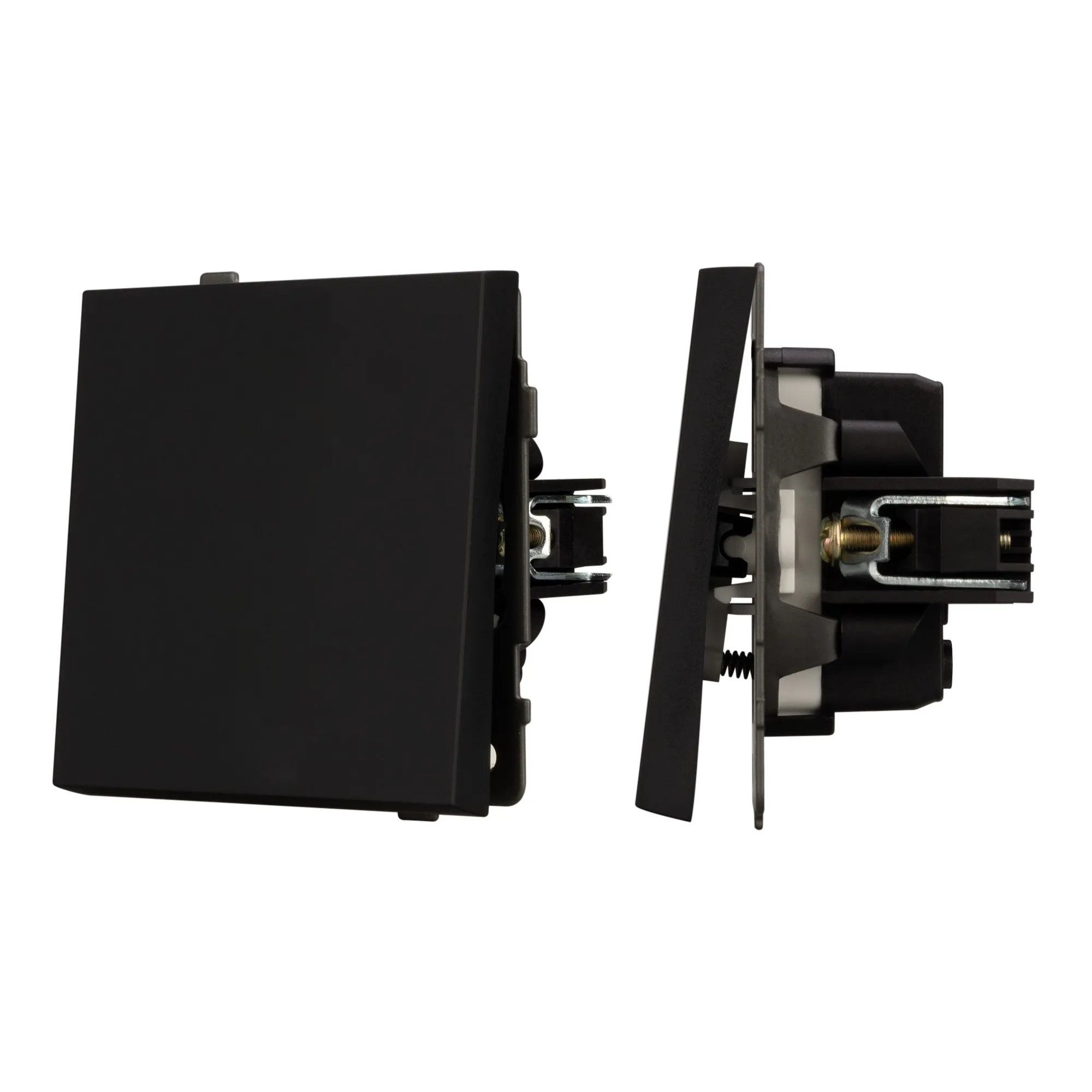 Механизм выключателя света клавишный на 1 пост 1 клавиша (перекрестный). Цвет - черный, с Soft-Touch покрытием. Без фронтальной рамки. Уровень пылевлагозащиты IP20. Выключатель устанавливается в стандартный подрозетник круглого сечения диаметром 60мм.