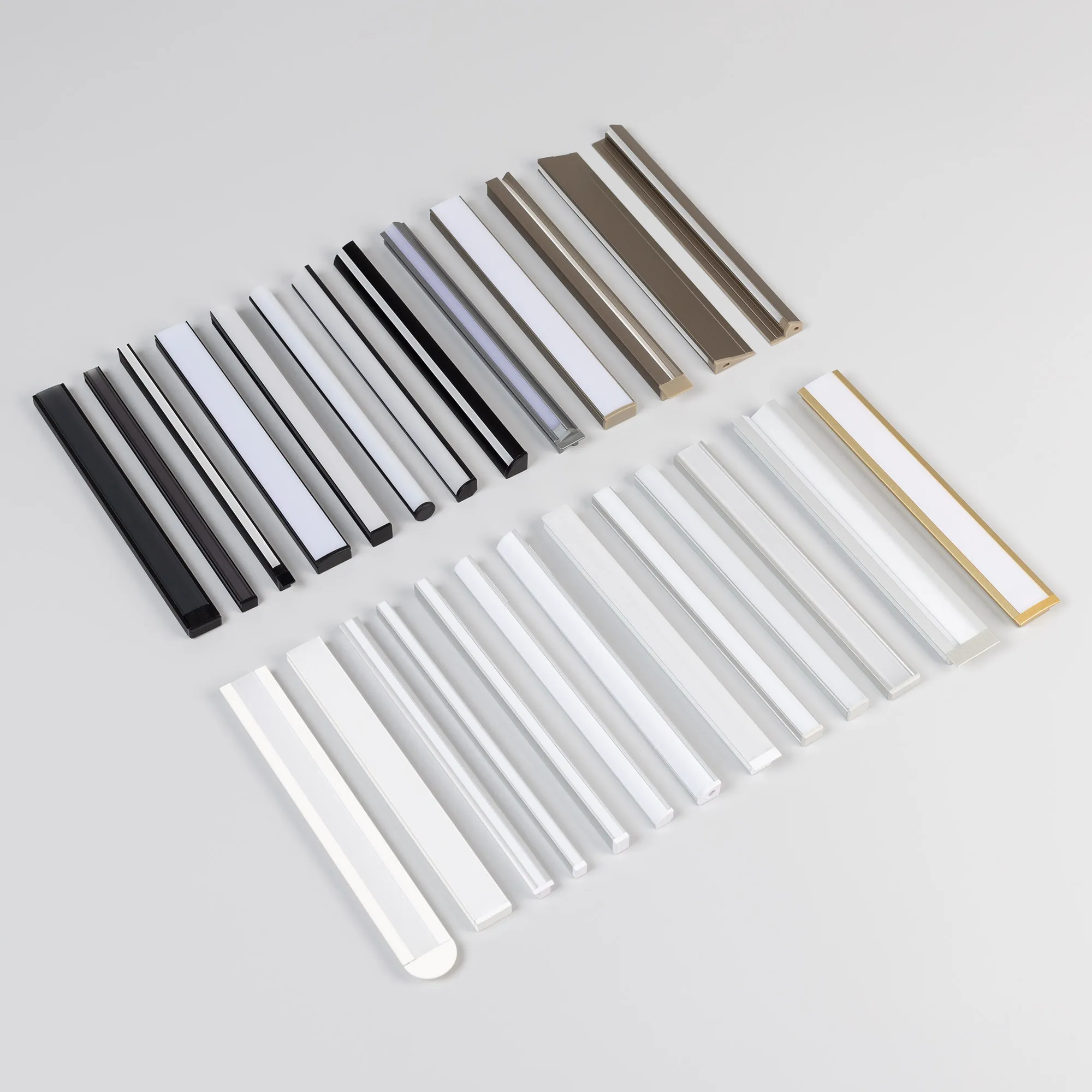 Набор образцов мебельных профилей ARLIGHT с экранами и заглушками.