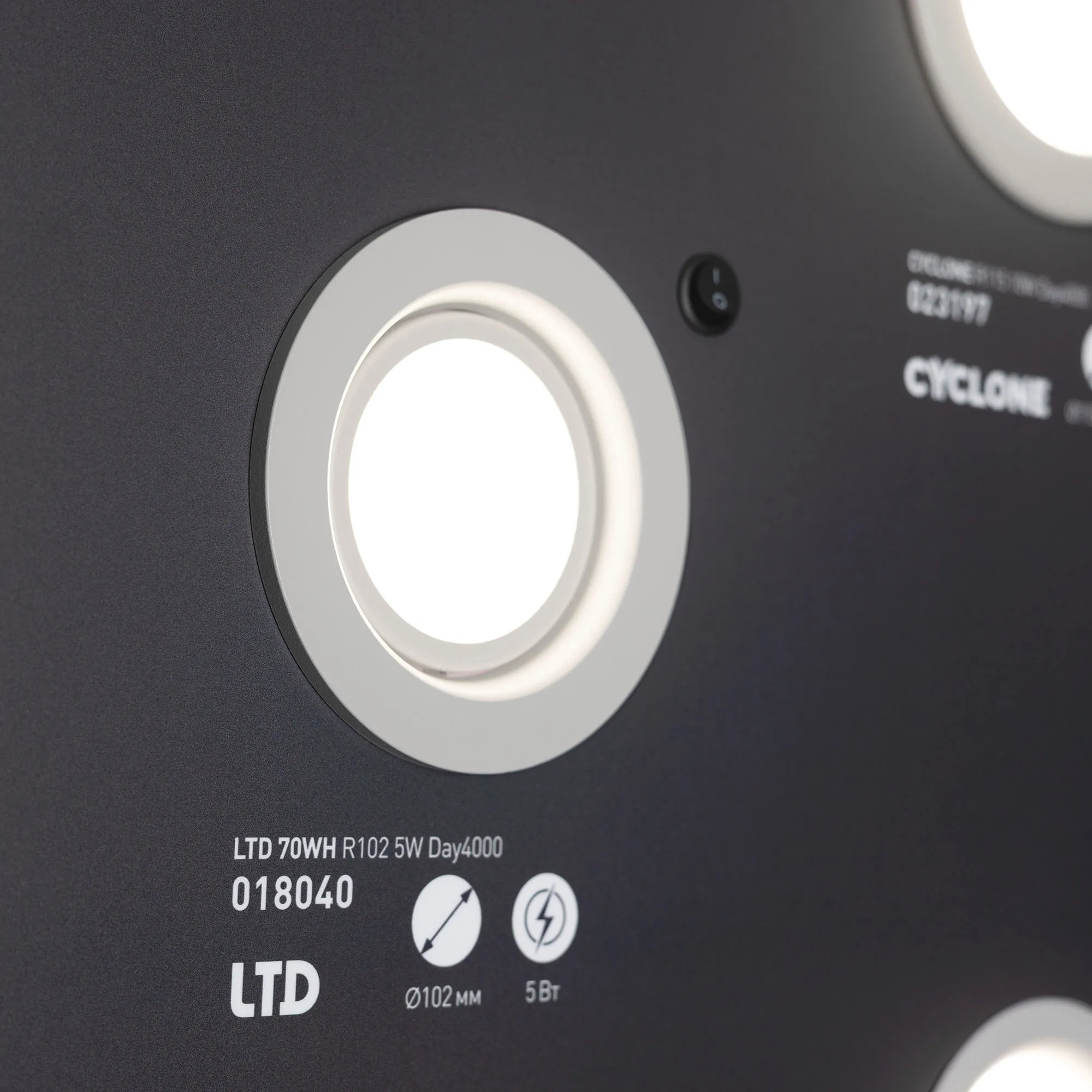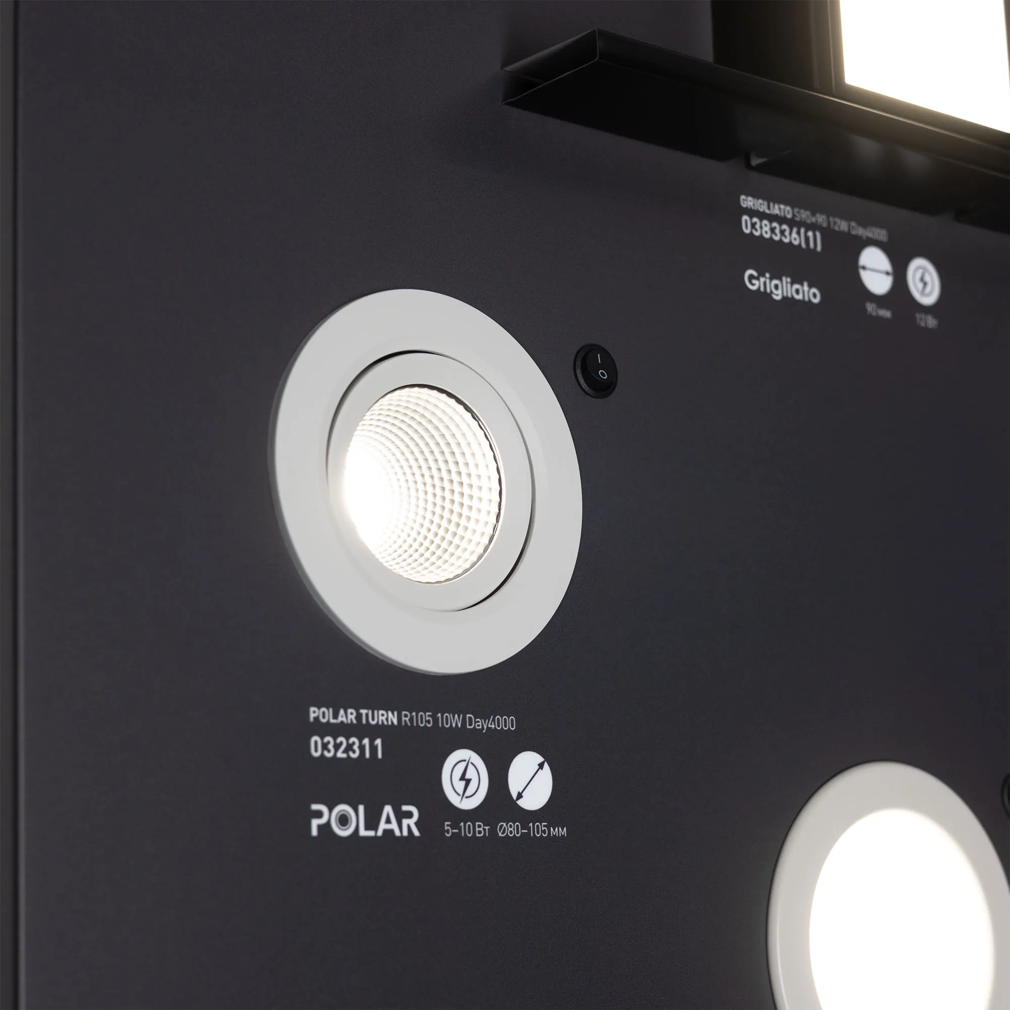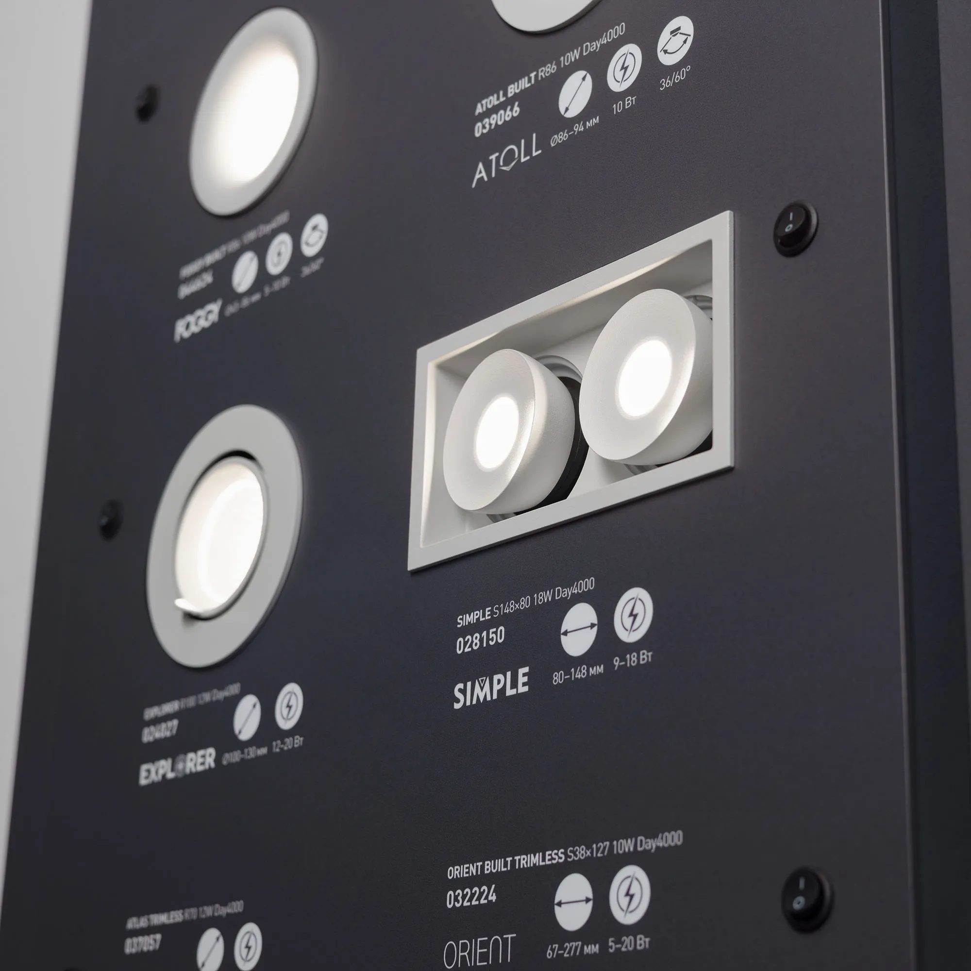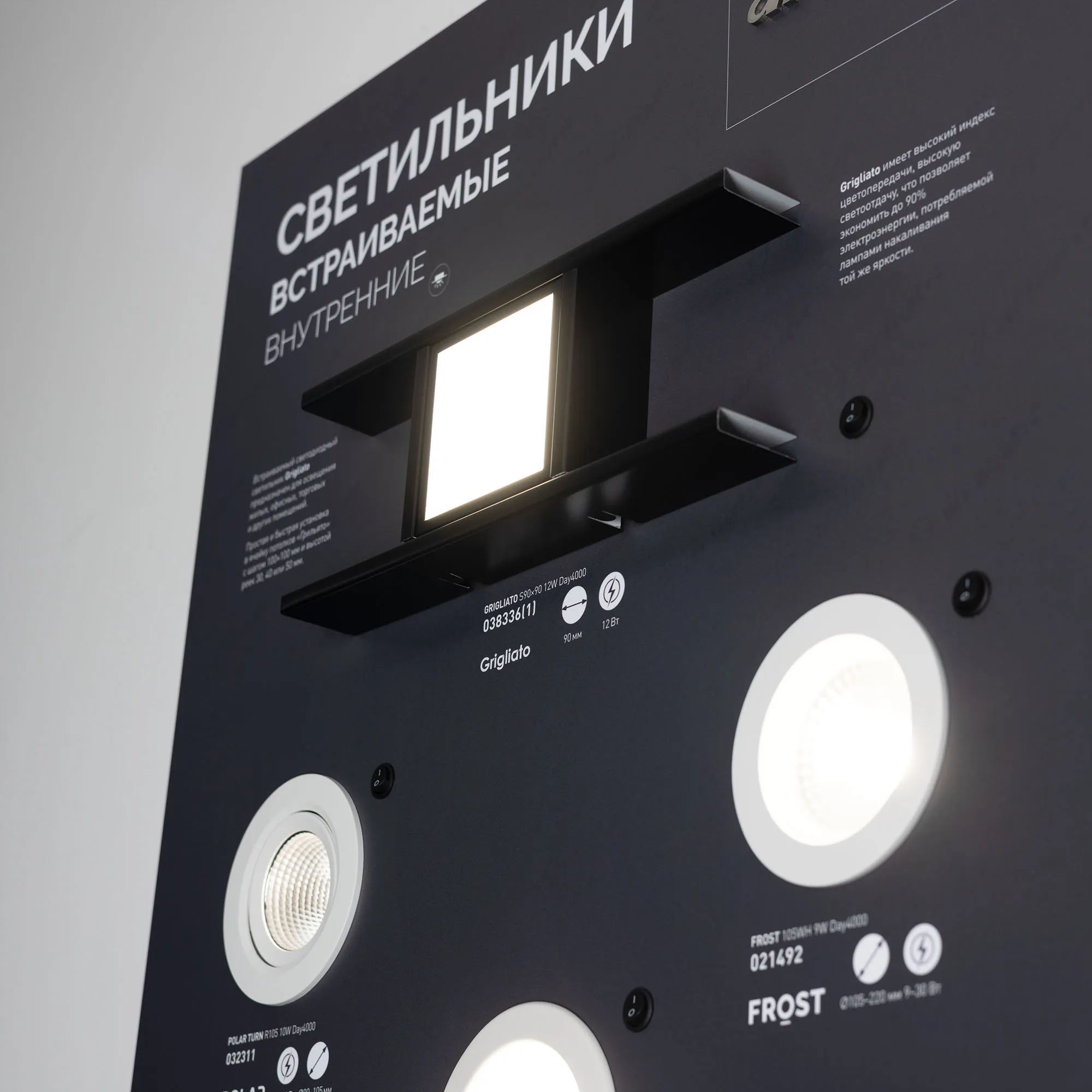 На стенде демонстрируются даунлайты разных размеров.