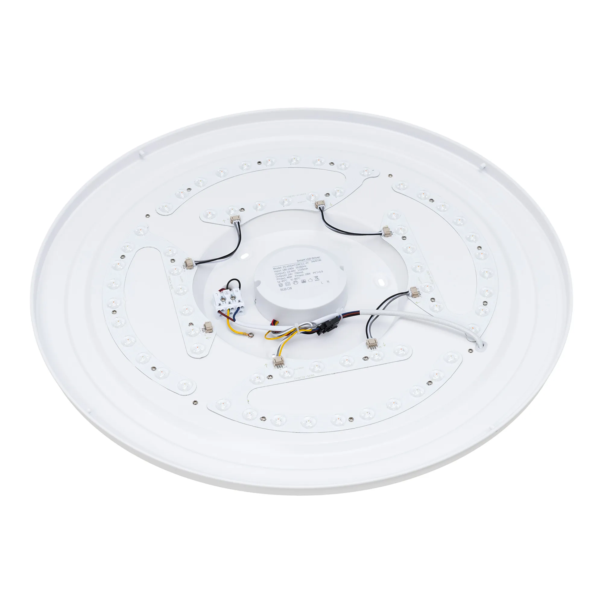 Светодиодный светильник с изменяемой цветовой температурой в диапазоне от 2700К до 6500К, с верхней подсветкой RGB. Мощность полная 50 Вт, св. поток 3000-3750 лм, 60-75 лм/Вт, CRI>90, угол 100°, напряжение питания 230 В. Белый круглый корпус из пластика, экран PC, степень защиты IP20. Размер: диаметр 570 мм, ширина 600 мм, высота 114 мм. Монтаж накладной. Драйвер TUYA Zigbee 23-40 В, 1300 мА, пульсация <5%. Мобильное приложение Smart Life или Intelligent Arlight для iOS и Android.