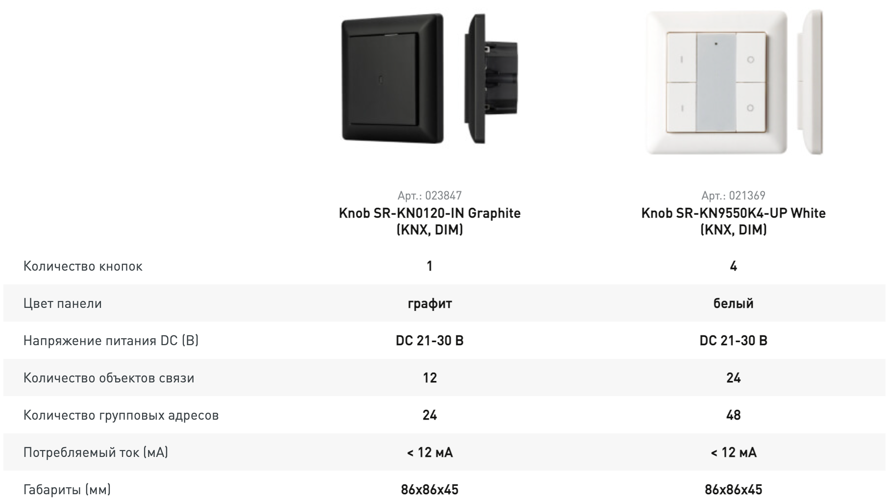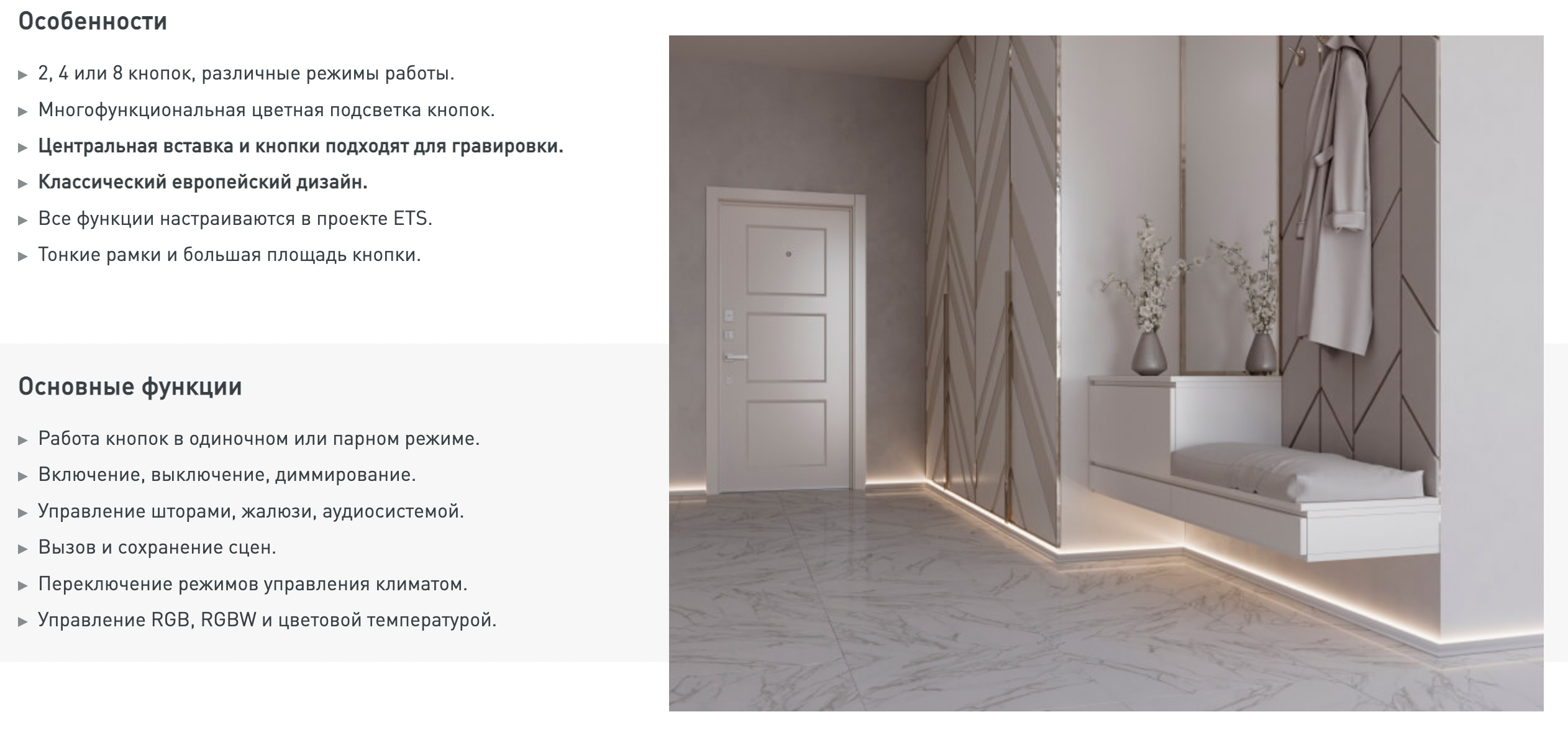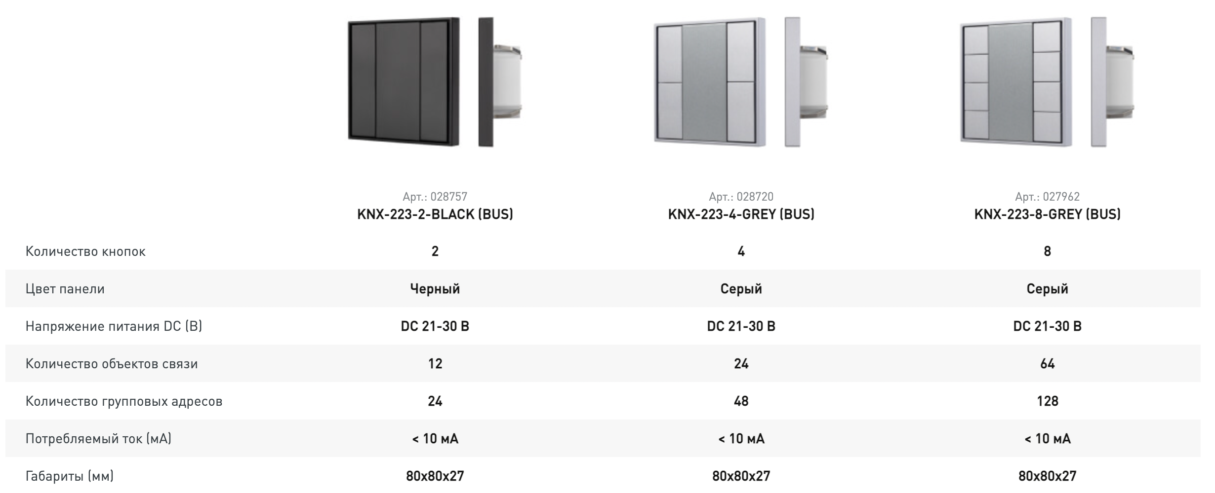 Многофункциональные кнопочные настенные панели стандарта KNX оборудованы привычными и тактильно понятными нажимными кнопками, что является решающим фактором при выборе для некоторых пользователей. Панели могут применяться для управления светом, климатом, светодиодными лентами, в том числе RGBW и MIX, шторами, отдельными группами света, включением сцен и сценариев, а также другими устройствами. Наличие моделей с разным количеством кнопок позволяет выбрать панель, максимально подходящую под конкретную задачу.